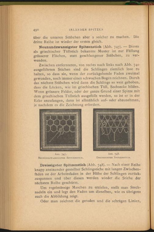 Zwischen entfernteren, von rechts nach links nach Abb. 740 ausgeführten Stichen sind die Schlingen ziemlich lose zu halten, so dass sie, wenn der zurückgehende Faden zweimal gewunden, noch immereinen schwachen Bogen zeichnen. Durch das nächste Stäbchen wird dann die Schlinge so weit gehoben, dass die Lücken, wie im griechischen Tüll, Sechsecke bilden. Wenn grössere Felder, oder der ganze Grund einer Spitze mit dem griechischen Tüllstich ausgefüllt werden, so ist er in der Ecke anzufangen, dann ist allmählich auf- oder abzunehmen, je nachdem es die Zeichnung erfordert.