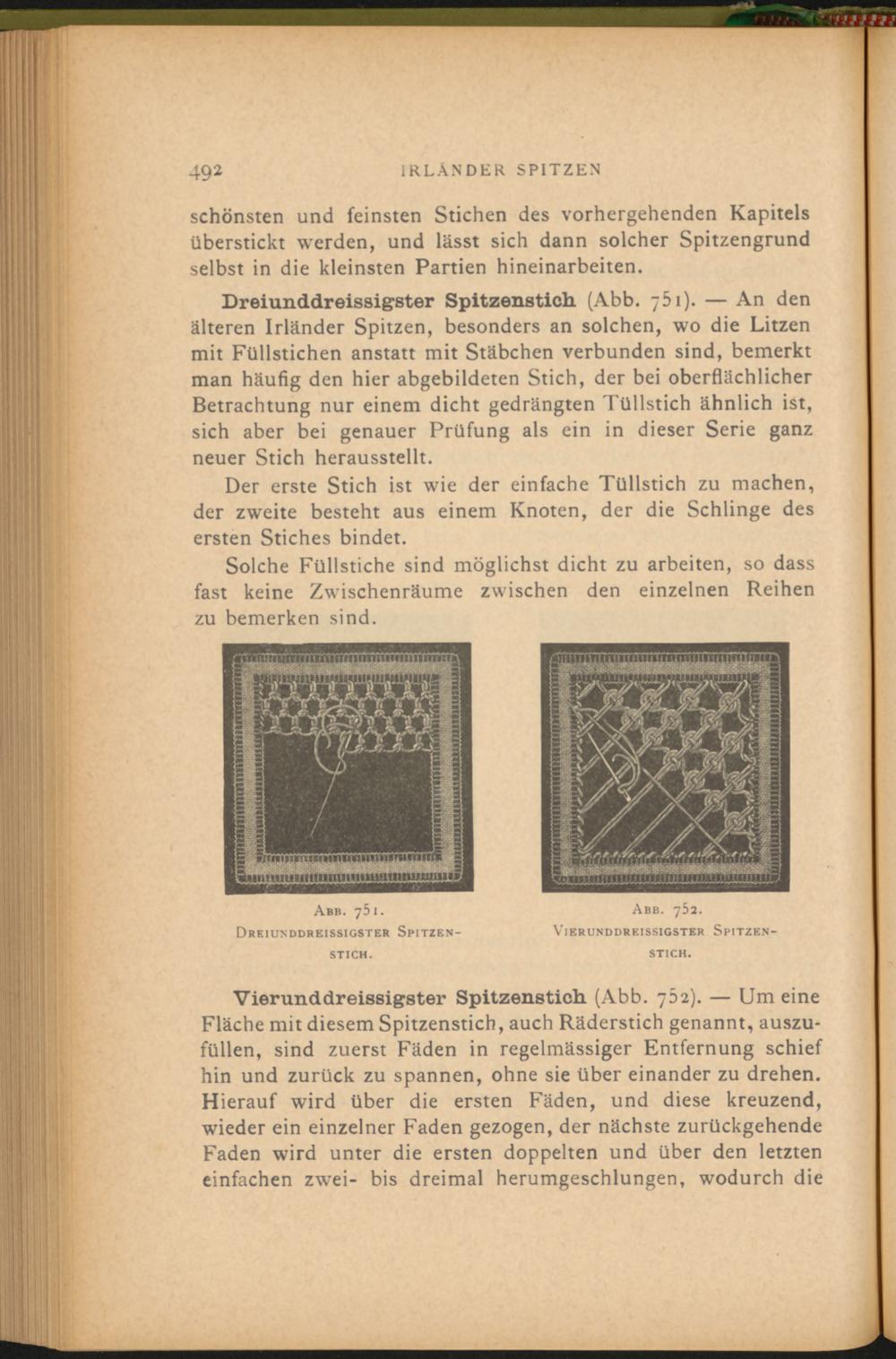 Dreiunddreissigster Spitzenstich. (Abb. 751). — An den älteren Irländer Spitzen, besonders an solchen, wo die Litzen mit Füllstichen anstatt mit Stäbchen verbunden sind, bemerkt man häufig den hier abgebildeten Stich, der bei oberflächlicher Betrachtung nur einem dicht gedrängten Tüllstich ähnlich ist, sich aber bei genauer Prüfung als ein in dieser Serie ganz neuer Stich herausstellt.