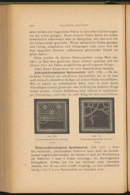 Achtunddreissigster Spitzenstich (Abb. 756). — Da der einfache Tüllstich am schnellsten herzustellen ist, so ist man auch versucht, denselben häufiger als andere Stiche auszuführen. Wo er jedoch zu unbedeutend wäre, kann er noch durch Hinzufügen einzeln gestreuter oder in Gruppen vereinter Ringe belebt werden. Unsere Abbildung zeigt letztere in regelmässiger Versetzung; auch hier ist jeder Ring für sich auszuführen.
