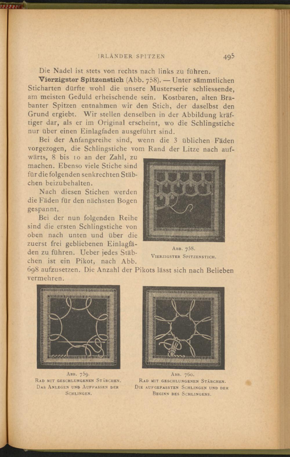 Vierzigster Spitzenstich (Abb. 768). — Unter sämmtlichen Sticharten dürfte wohl die unsere Musterserie schliessende, am meisten Geduld erheischende sein. Kostbaren, alten Bra- banter Spitzen entnahmen wir den Stich, der daselbst den Grund ergiebt. Wir stellen denselben in der Abbildung kräftiger dar, als er im Original erscheint, wo die Schlingstiche nur über einen Einlagfaden ausgeführt sind.