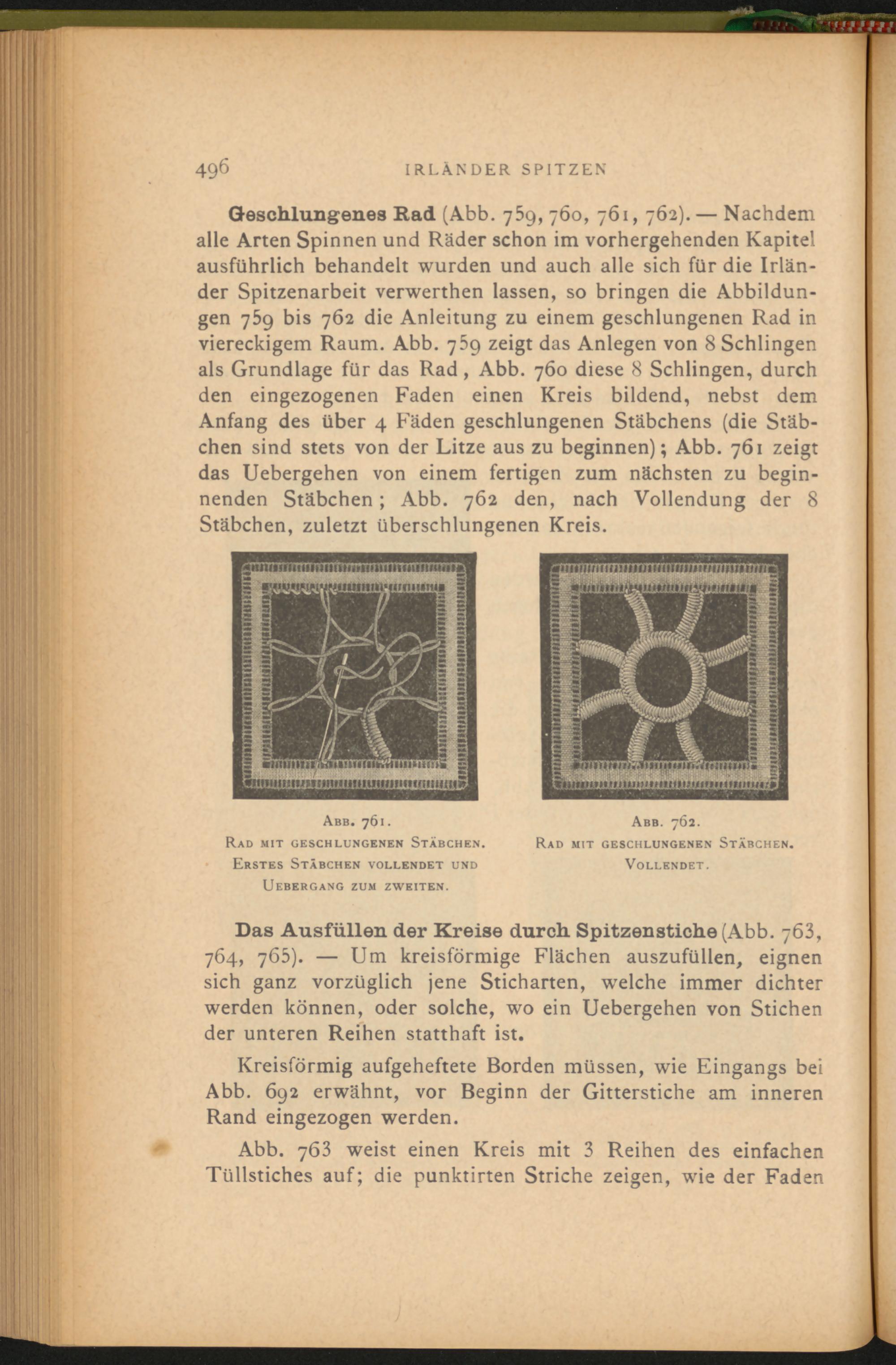 Abb. 763 weist einen Kreis mit 3 Reihen des einfachen Tüllstiches auf; die punktirten Striche zeigen, wie der Faden