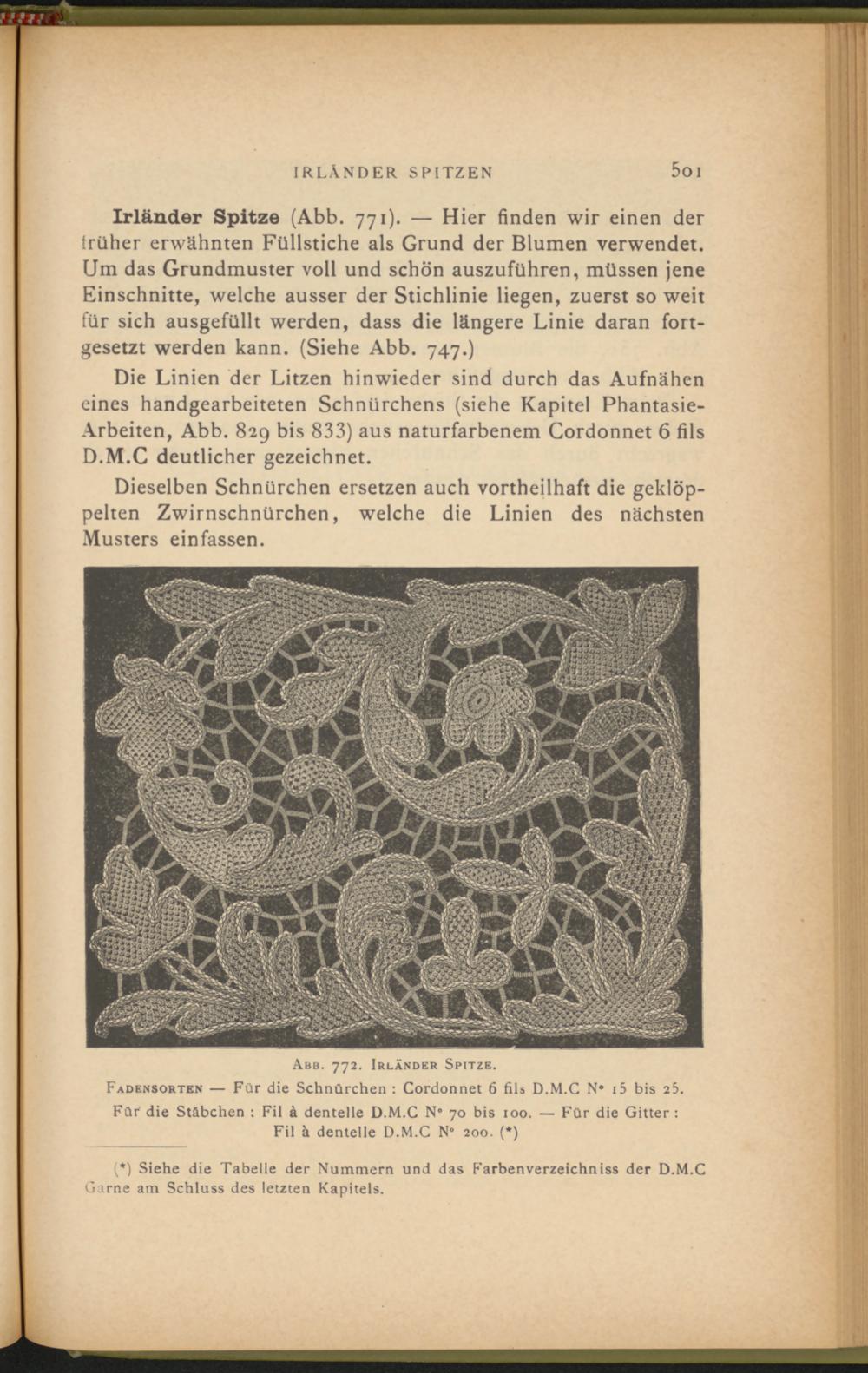 Irländer Spitze (Abb. 771). — Hier finden wir einen der früher erwähnten Füllstiche als Grund der Blumen verwendet. Um das Grundmuster voll und schön auszuführen, müssen jene Einschnitte, welche ausser der Stichlinie liegen, zuerst so weit für sich ausgefüllt werden, dass die längere Linie daran fortgesetzt werden kann. (Siehe Abb. 747.)