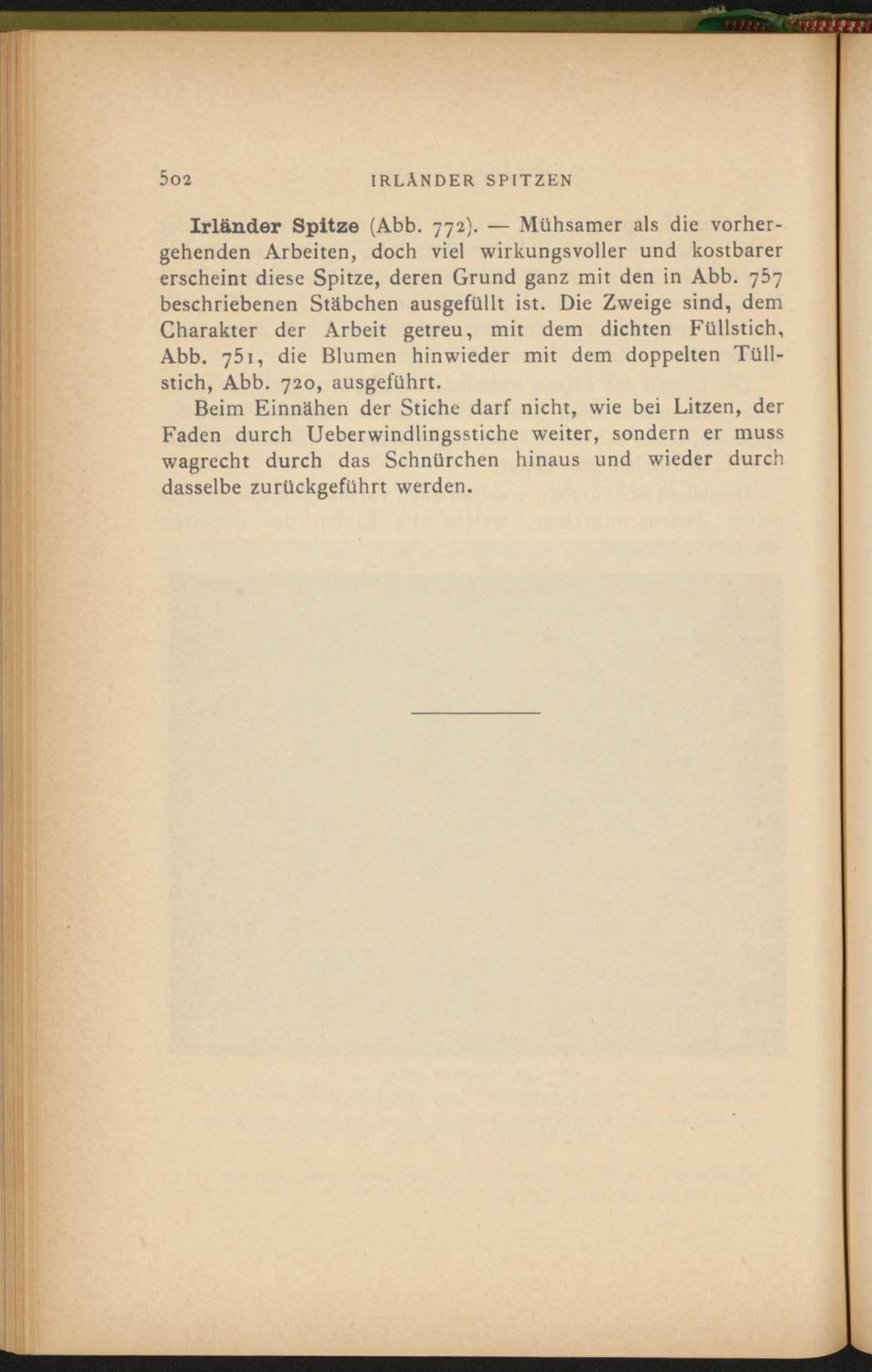 Irländer Spitze (Abb. 772). — Mühsamer als die vorhergehenden Arbeiten, doch viel wirkungsvoller und kostbarer erscheint diese Spitze, deren Grund ganz mit den in Abb. 757 beschriebenen Stäbchen ausgefüllt ist. Die Zweige sind, dem Charakter der Arbeit getreu, mit dem dichten Füllstich, Abb. 751, die Blumen hinwieder mit dem doppelten Tüllstich, Abb. 720, ausgeführt.