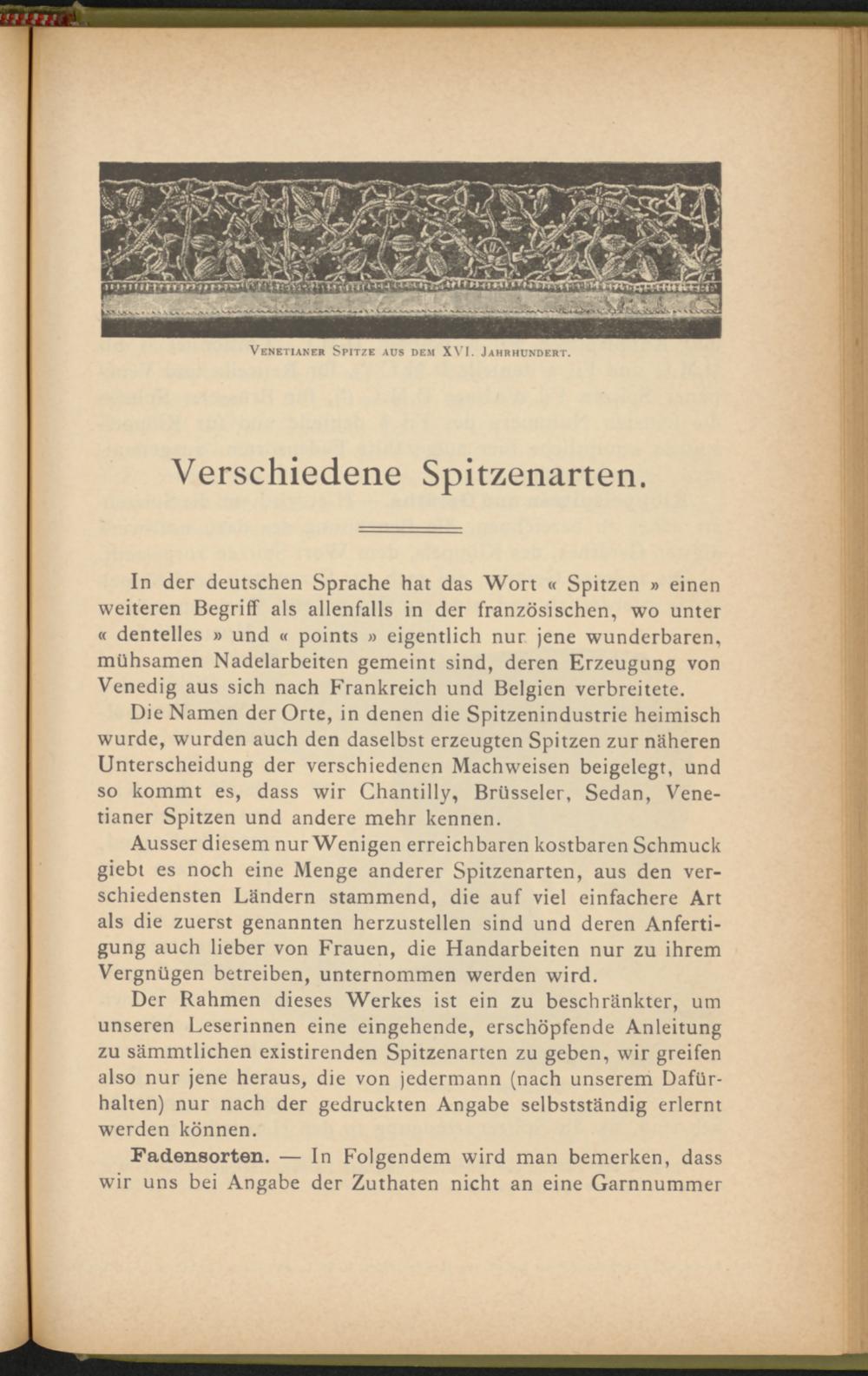 In der deutschen Sprache hat das Wort « Spitzen » einen weiteren Begriff als allenfalls in der französischen, wo unter « dentelles » und « points » eigentlich nur jene wunderbaren, mühsamen Nadelarbeiten gemeint sind, deren Erzeugung von Venedig aus sich nach Frankreich und Belgien verbreitete.