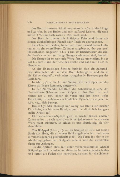 In der Normandie benützen die Arbeiterinnen eine Art überpolsterte Schachtel zum Klöppeln. Das Brett ist nach hinten um 3 c/m. höher als vorne und hat einen tiefen Einschnitt, in welchem ein ähnlicher Cylinder, wie jener in Abb. 774, sich bewegt.