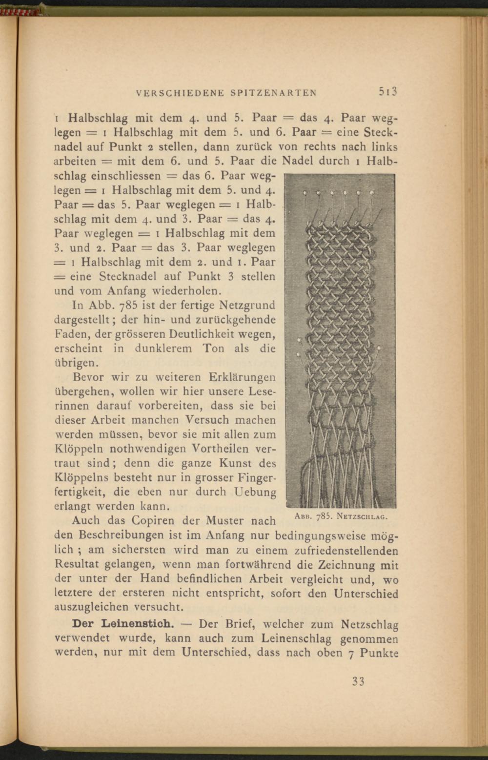In Abb. 785 ist der fertige Netzgrund dargestellt; der hin- und zurückgehende Faden, der grösseren Deutlichkeit wegen, erscheint in dunklerem Ton als die übrigen.
