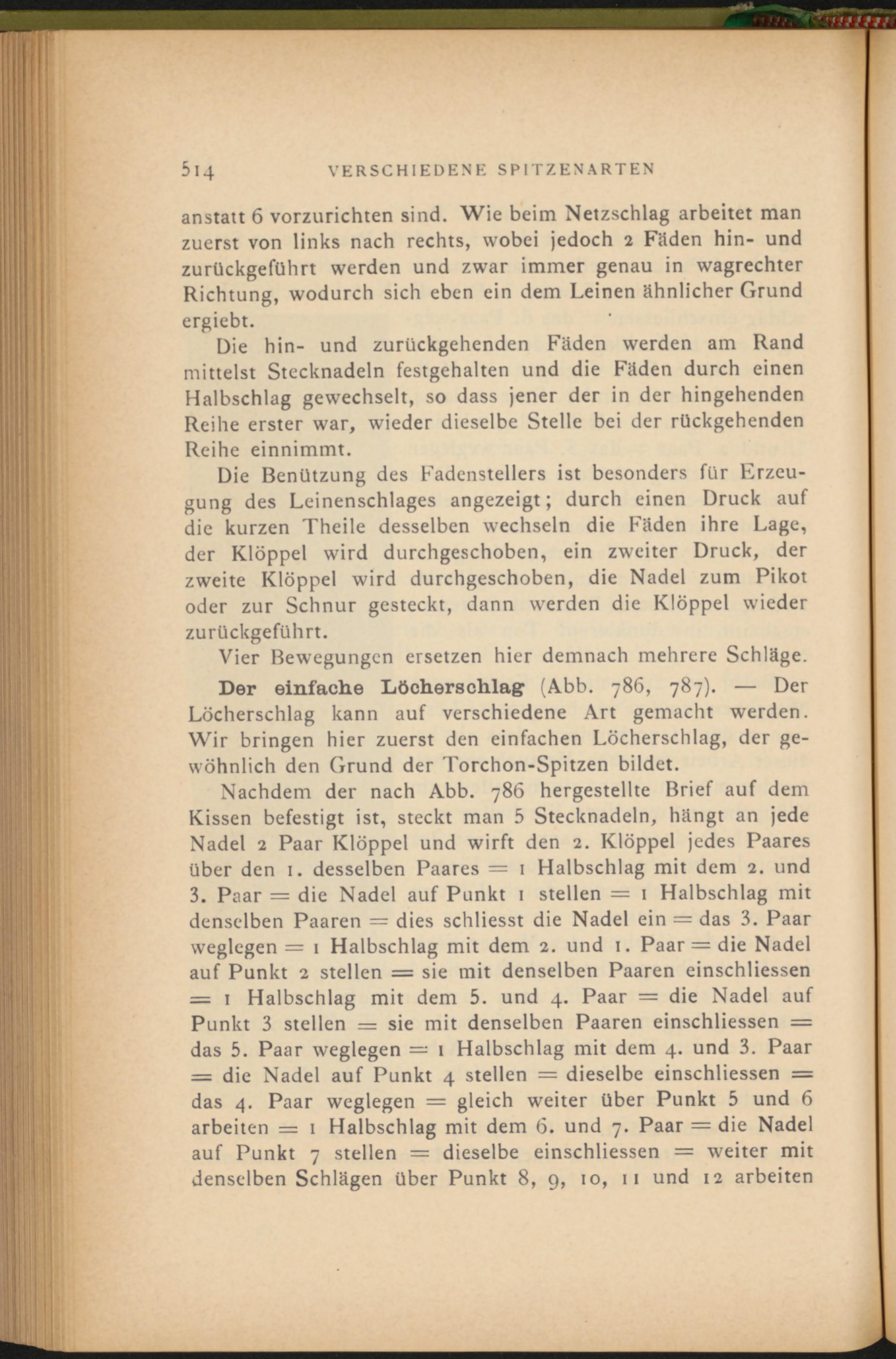 Der einfache Löcherschlag; (Abb. 786, 787). — Der Löcherschlag kann auf verschiedene Art gemacht werden. Wir bringen hier zuerst den einfachen Löcherschlag, der gewöhnlich den Grund der Torchon-Spitzen bildet.