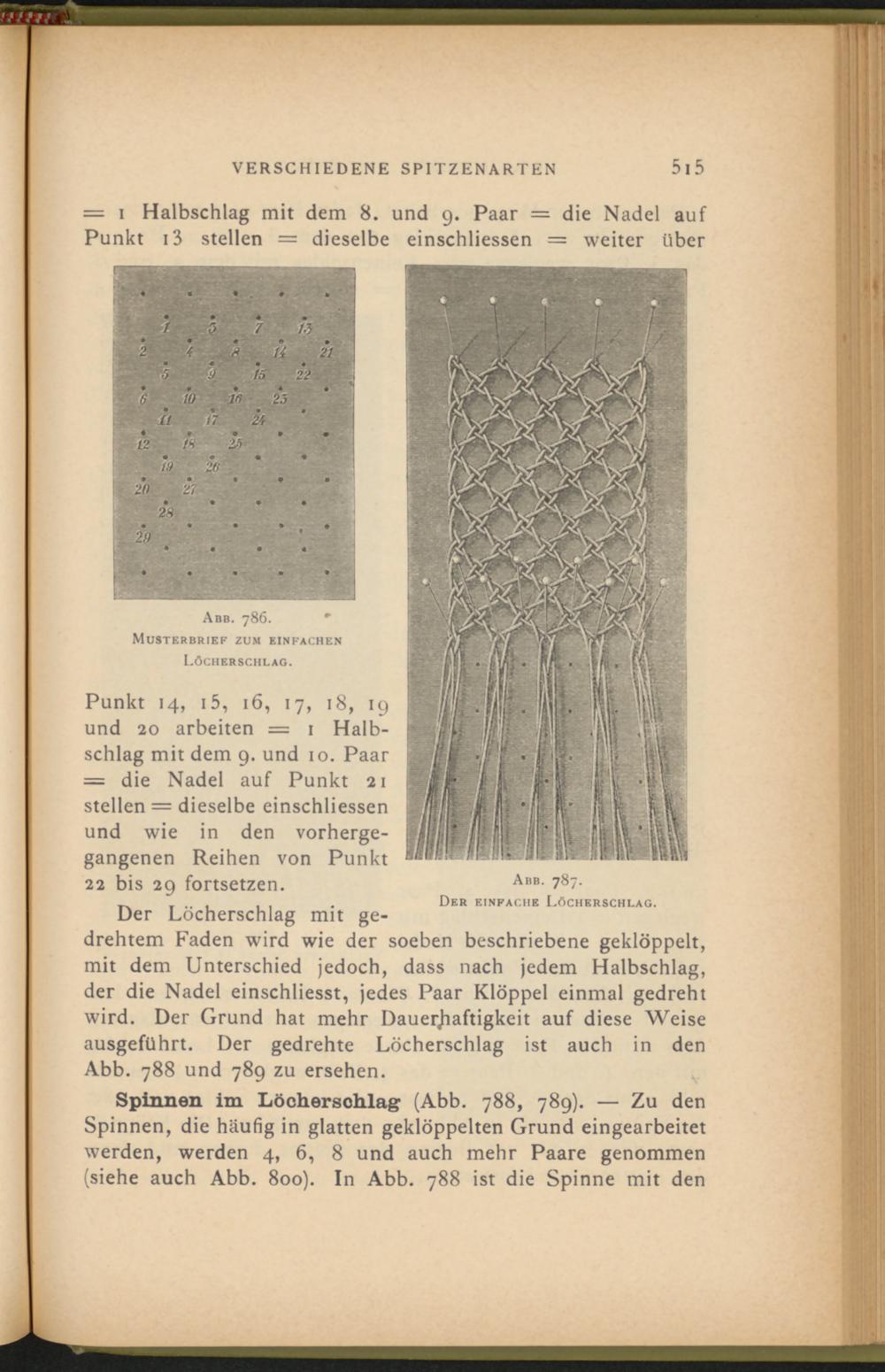 Der Löcherschlag mit gedrehtem Faden wird wie der soeben beschriebene geklöppelt, mit dem Unterschied jedoch, dass nach jedem Halbschlag, der die Nadel einschliesst, jedes Paar Klöppel einmal gedreht wird. Der Grund hat mehr Dauerhaftigkeit auf diese Weise ausgeführt. Der gedrehte Löcherschlag ist auch in den Abb. 788 und 789 zu ersehen.
