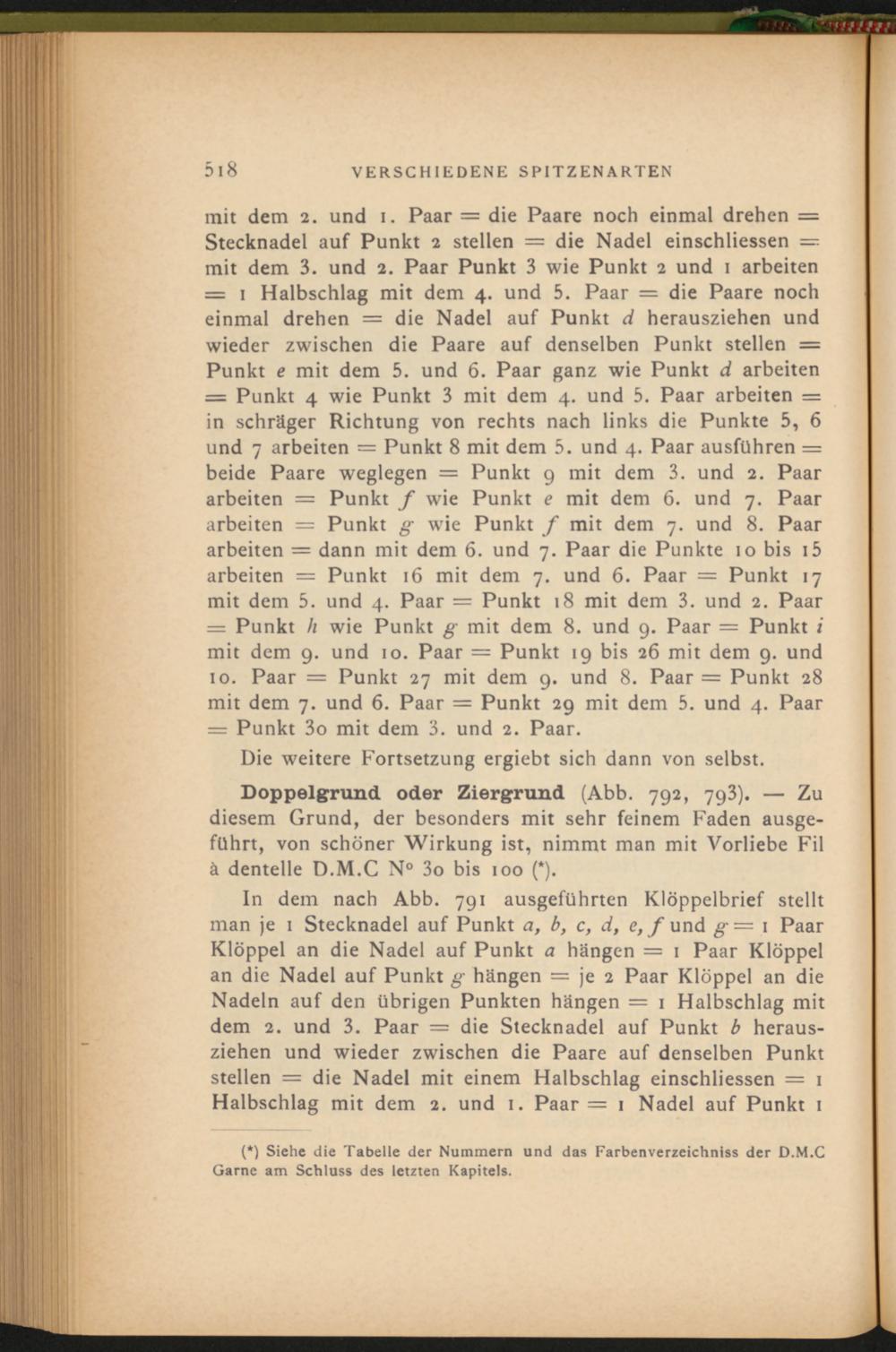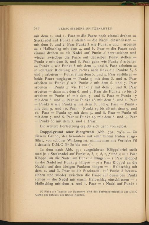 Doppelgrund oder Ziergrund (Abb. 792, 793). — Zu diesem Grund, der besonders mit sehr feinem Faden ausgeführt, von schöner Wirkung ist, nimmt man mit Vorliebe Fil ä dentelle D.M.C N° 3 o bis 100 (*).