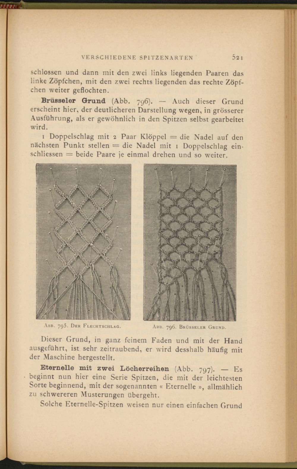 Brüsseler Grund (Abb. 796). — Auch dieser Grund erscheint hier, der deutlicheren Darstellung wegen, in grösserer Ausführung, als er gewöhnlich in den Spitzen selbst gearbeitet wird.
