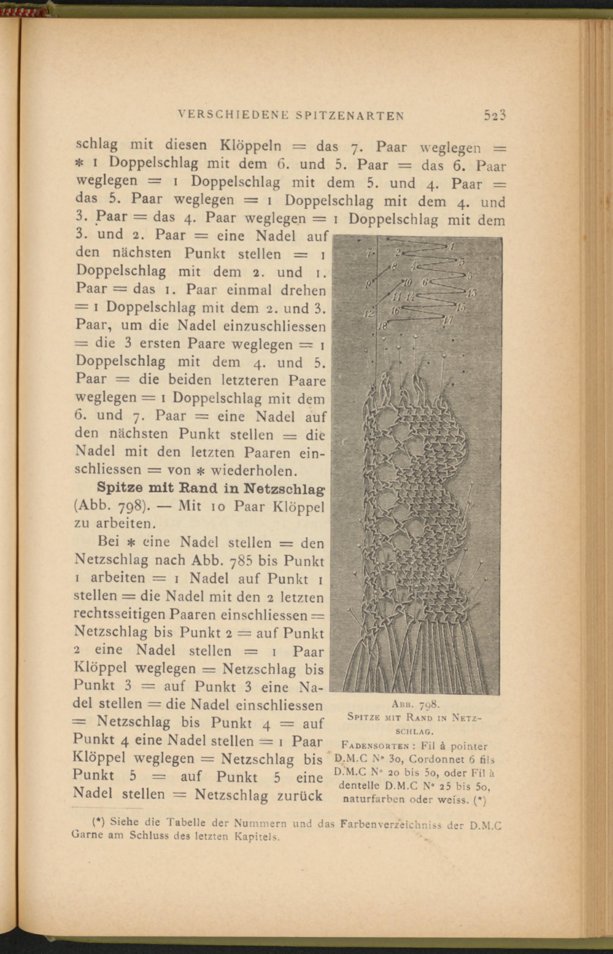 Spitze mit Hand in Netzschlag (Abb. 798). — Mit 10 Paar Klöppel zu arbeiten.