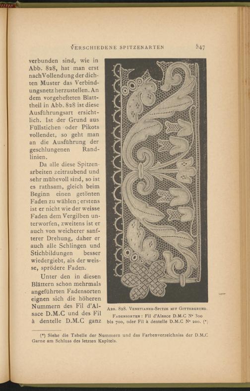 verbunden sind, wie in Abb. 828, hat man erst nachVollendung der dichten Muster das Verbindungsnetz herzustellen. An dem vorgehefteten Blatt- theil in Abb. 828 ist diese Ausführungsart ersichtlich. Ist der Grund aus Füllstichen oder Pikots vollendet, so geht man an die Ausführung der geschlungenen Randlinien.
