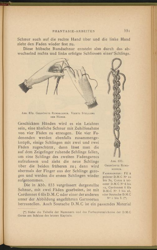 Die in Abb. 833 vergrössert dargestellte Schnur, mit zwei Fäden gearbeitet, ist mit Cordonnet 6filsD.M.C oder einer der anderen