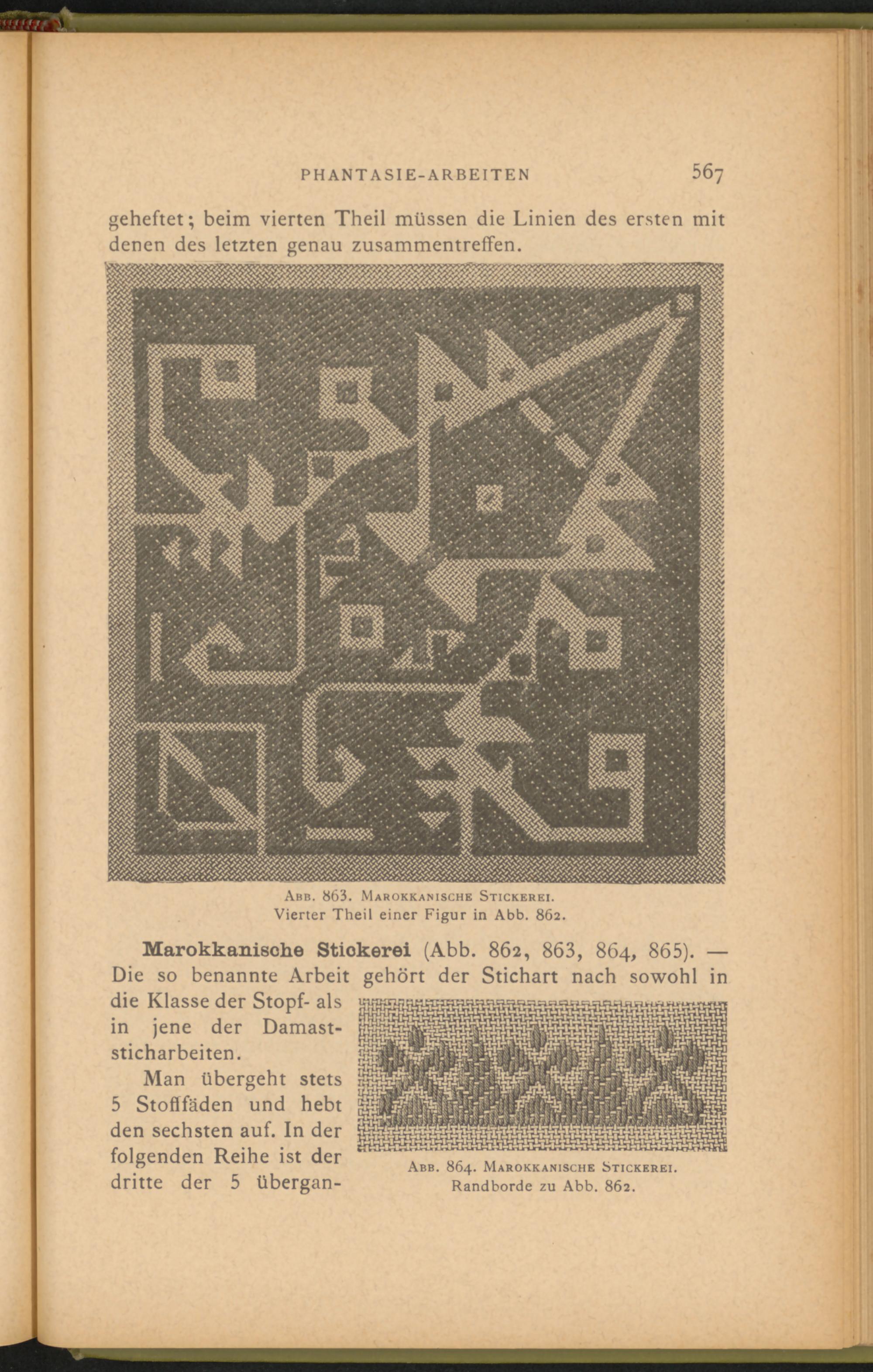 Marokkanische Stiokerei (Abb. 862, 863, 864, 865). — Die so benannte Arbeit gehört der Stichart nach sowohl in die Klasse der Stopf- als in jene der Damaststicharbeiten.