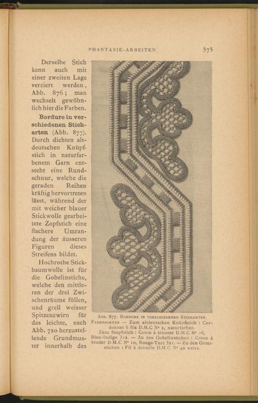Arb. 877. Bordure in verschiedenen Sticharten. Fadensorten — Zum altdeutschen Knüpfstich : Cordonnet 6 fils D.M.C N* 2, naturfarben.