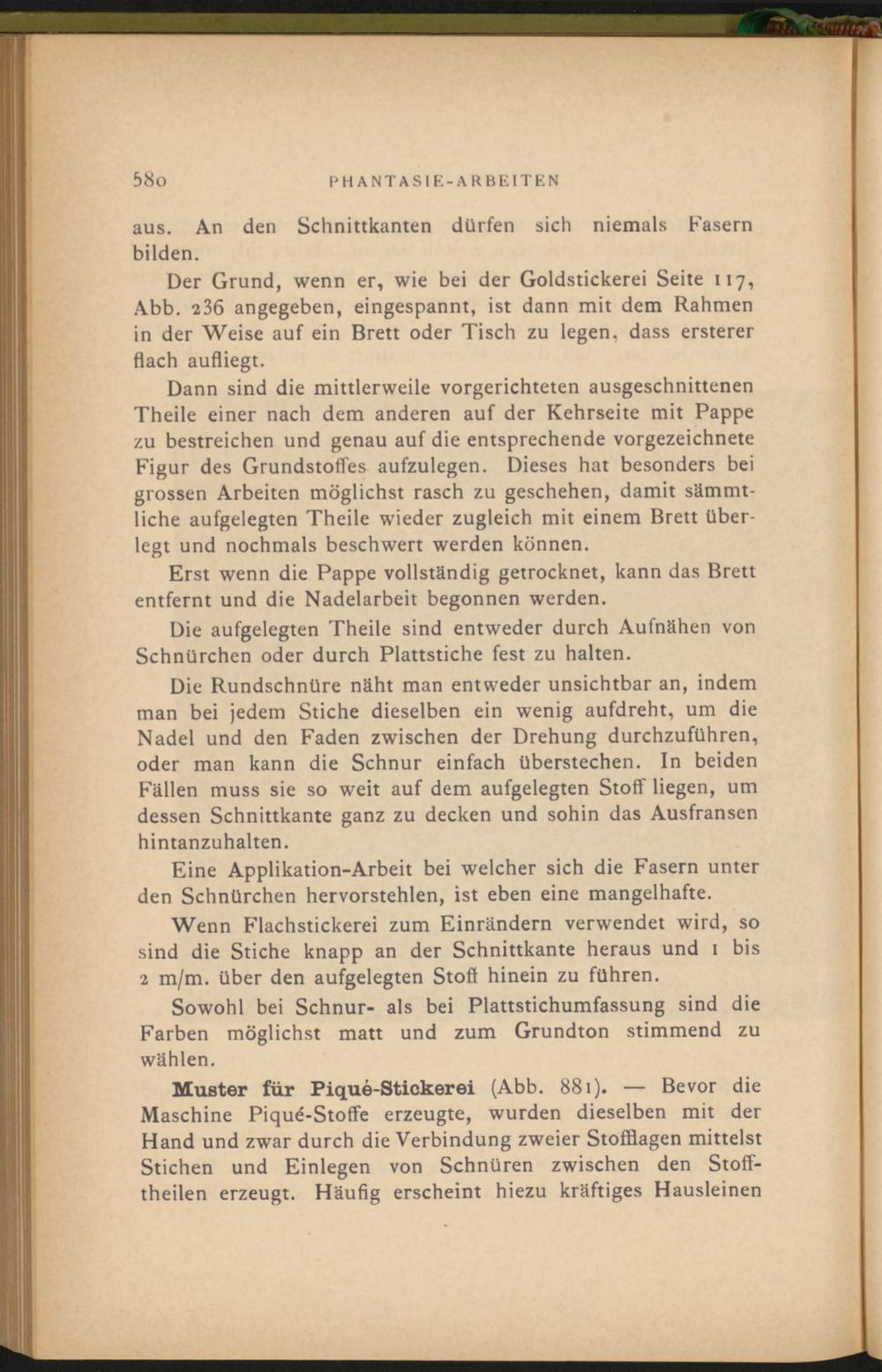Muster für Pique-Stickerei (Abb. 881). — Bevor die Maschine Piqud-Stoffe erzeugte, wurden dieselben mit der Hand und zwar durch die Verbindung zweier Stofflagen mittelst Stichen und Einlegen von Schnüren zwischen den Stoff- theilen erzeugt. Häufig erscheint hiezu kräftiges Hausleinen