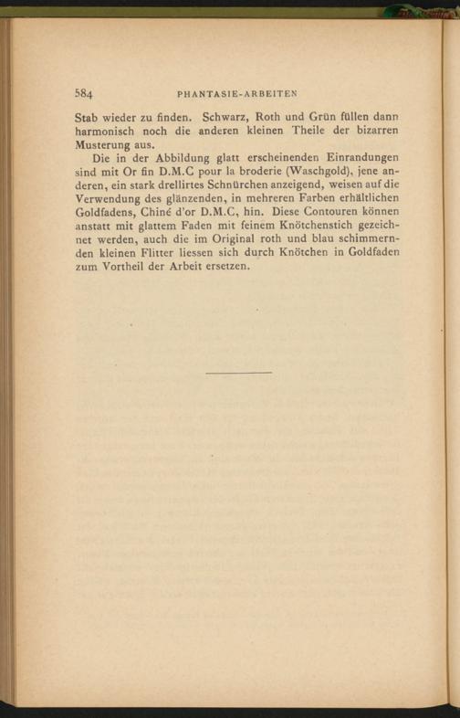 Die in der Abbildung glatt erscheinenden Einrandungen sind mit Or fin D.M.C pour la broderie (Waschgold), jene anderen, ein stark drellirtes Schnürchen anzeigend, weisen auf die Verwendung des glänzenden, in mehreren Farben erhältlichen Goldfadens, Chine' d’or D.M.C, hin. Diese Contouren können anstatt mit glattem Faden mit feinem Knötchenstich gezeichnet werden, auch die im Original roth und blau schimmernden kleinen Flitter Hessen sich durch Knötchen in Goldfaden zum Vortheil der Arbeit ersetzen.