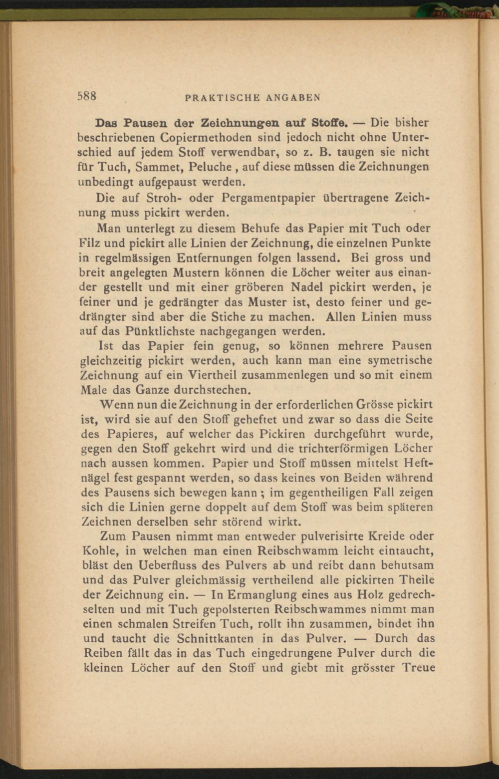 Das Pausen der Zeichnungen auf Stoffe. — Die bisher beschriebenen Copiermethoden sind jedoch nicht ohne Unterschied auf jedem Stoff verwendbar, so z. B. taugen sie nicht für Tuch, Sammet, Peluche , auf diese müssen die Zeichnungen unbedingt aufgepaust werden.