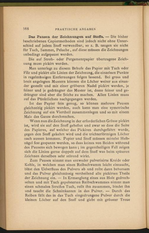Wenn nun die Zeichnung in der erforderlichen Grösse pickirt ist, wird sie auf den Stoff geheftet und zwar so dass die Seite des Papieres, auf welcher das Pickiren durchgeführt wurde, gegen den Stoff gekehrt wird und die trichterförmigen Löcher nach aussen kommen. Papier und Stoff müssen miitelst Heftnägel fest gespannt werden, so dass keines von Beiden während des Pausens sich bewegen kann ; im gegentheiligen Fall zeigen sich die Linien gerne doppelt auf dem Stoff was beim späteren Zeichnen derselben sehr störend wirkt.