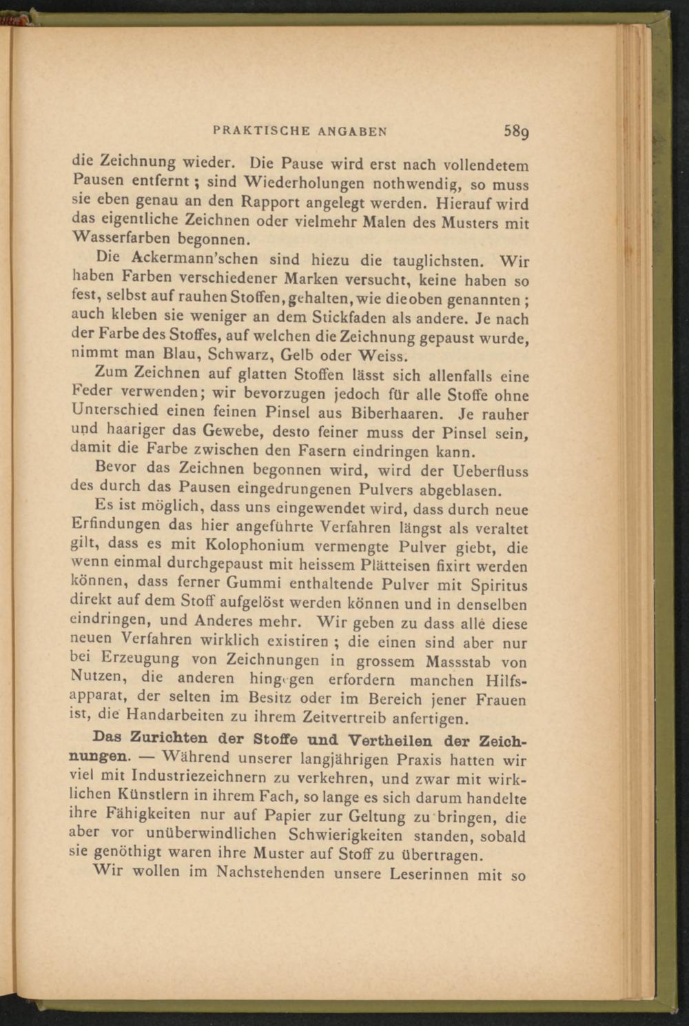 Die Ackermann’schen sind hiezu die tauglichsten. Wir haben Farben verschiedener Marken versucht, keine haben so fest, selbst auf rauhen Stoffen,gehalten, wie dieoben genannten ; auch kleben sie weniger an dem Stickfaden als andere. Je nach der Farbe des Stoffes, auf welchen die Zeichnung gepaust wurde, nimmt man Blau, Schwarz, Gelb oder Weiss.