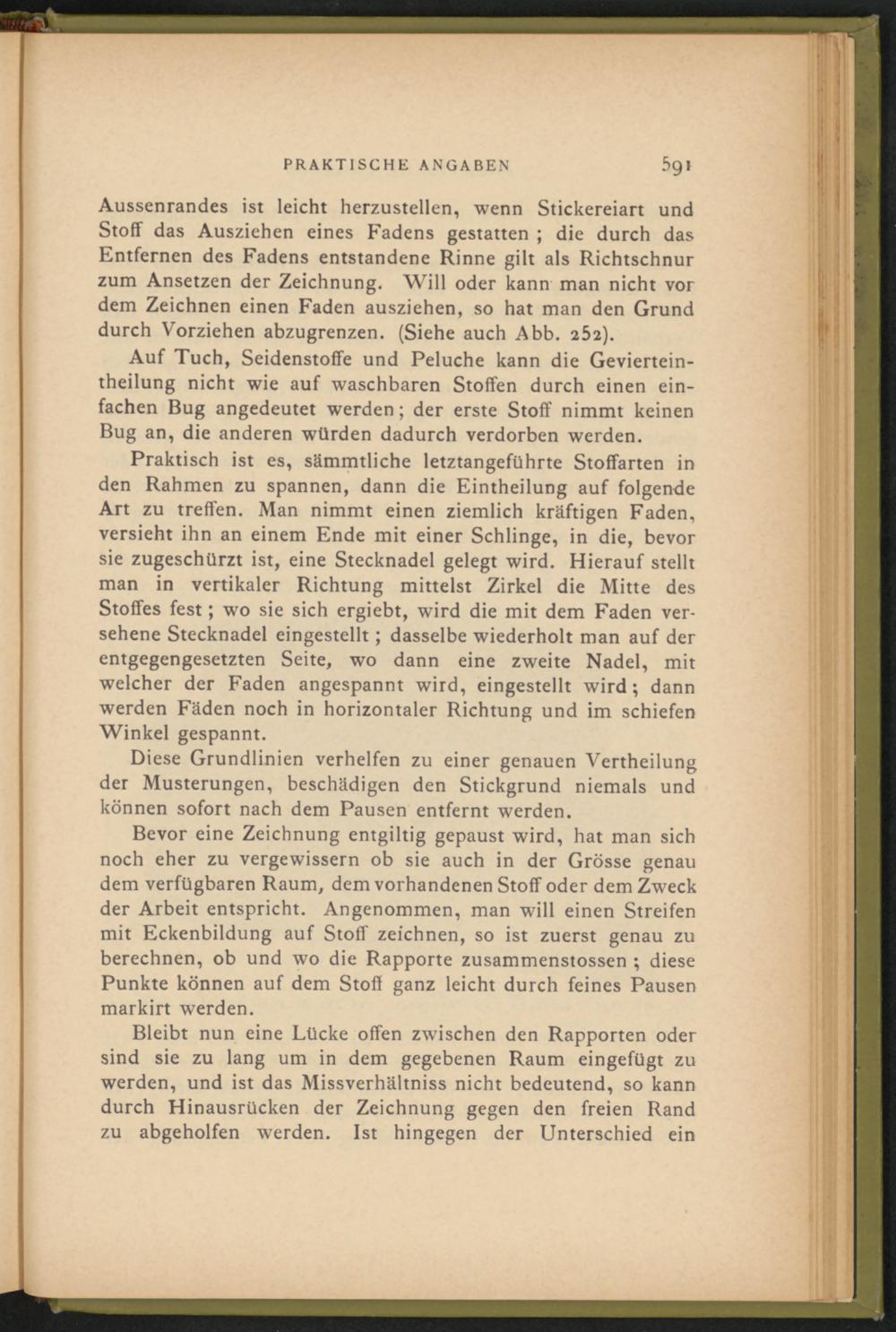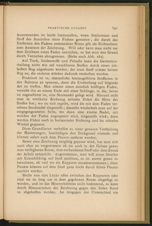 Aussenrandes ist leicht herzustellen, wenn Stickereiart und Stoff das Ausziehen eines Fadens gestatten ; die durch das Entfernen des Fadens entstandene Rinne gilt als Richtschnur zum Ansetzen der Zeichnung. Will oder kann man nicht vor dem Zeichnen einen Faden ausziehen, so hat man den Grund durch Vorziehen abzugrenzen. (Siehe auch Abb. 252 ).