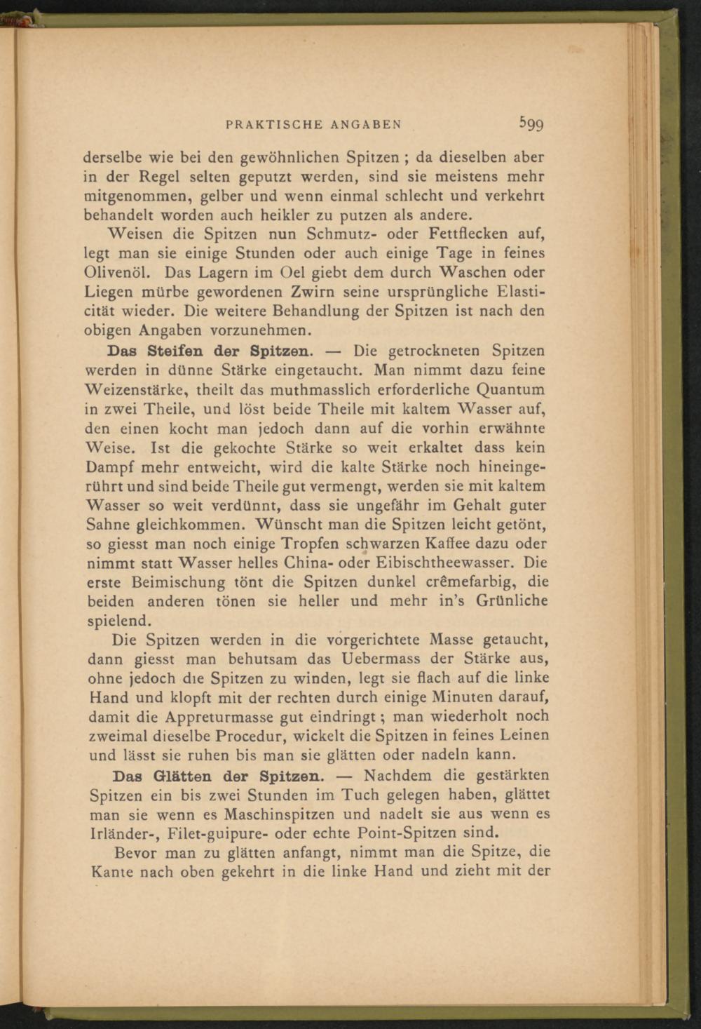 Weisen die Spitzen nun Schmutz- oder Fettflecken auf, legt man sie einige Stunden oder auch einige Tage in feines Olivenöl. Das Lagern im Oel giebt dem durch Waschen oder Liegen mürbe gewordenen Zwirn seine ursprüngliche Elasti- cität wieder. Die weitere Behandlung der Spitzen ist nach den obigen Angaben vorzunehmen.