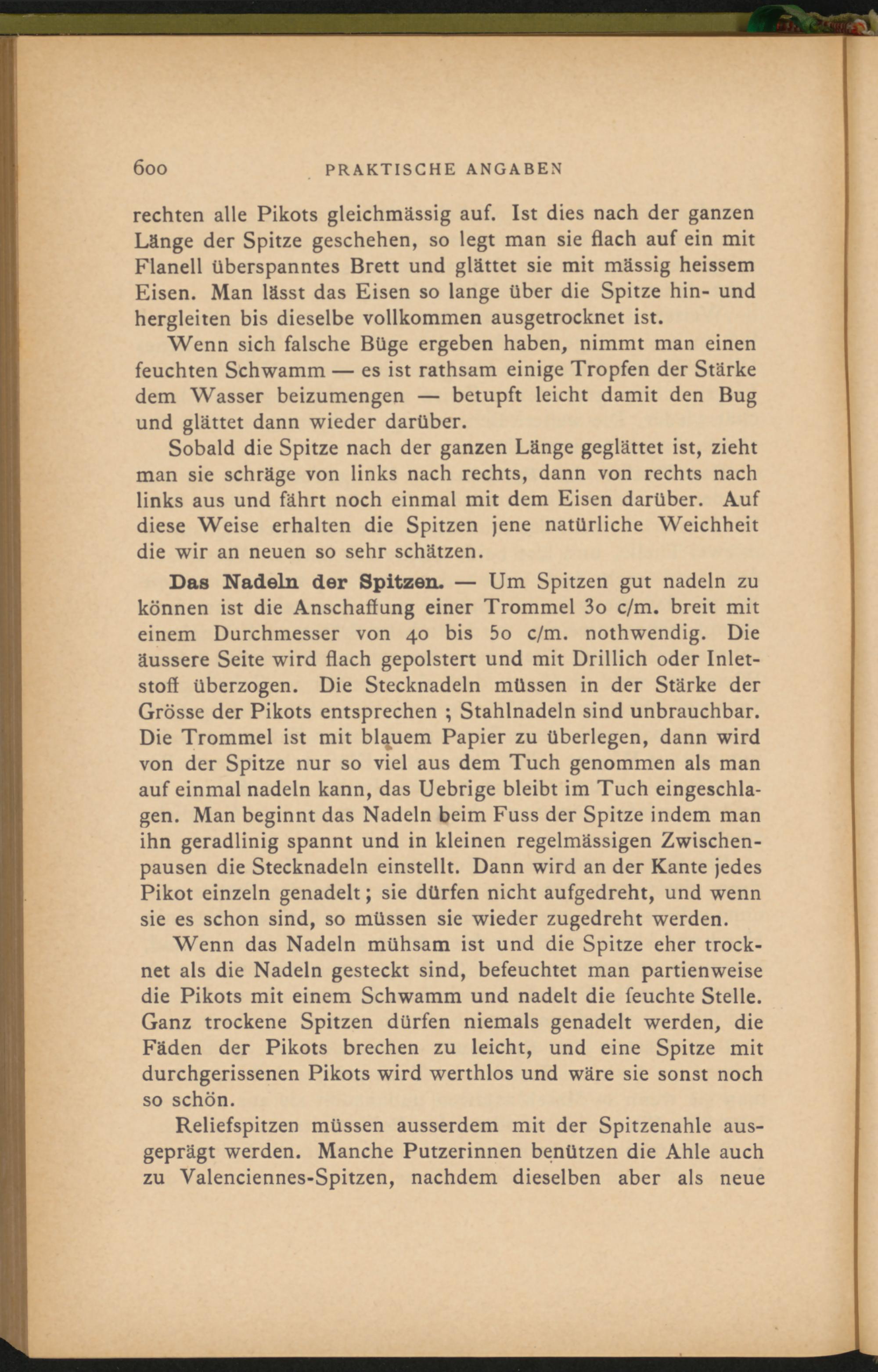 rechten alle Pikots gleichmässig auf. Ist dies nach der ganzen Länge der Spitze geschehen, so legt man sie flach auf ein mit Flanell überspanntes Brett und glättet sie mit mässig heissem Eisen. Man lässt das Eisen so lange über die Spitze hin- und hergleiten bis dieselbe vollkommen ausgetrocknet ist.
