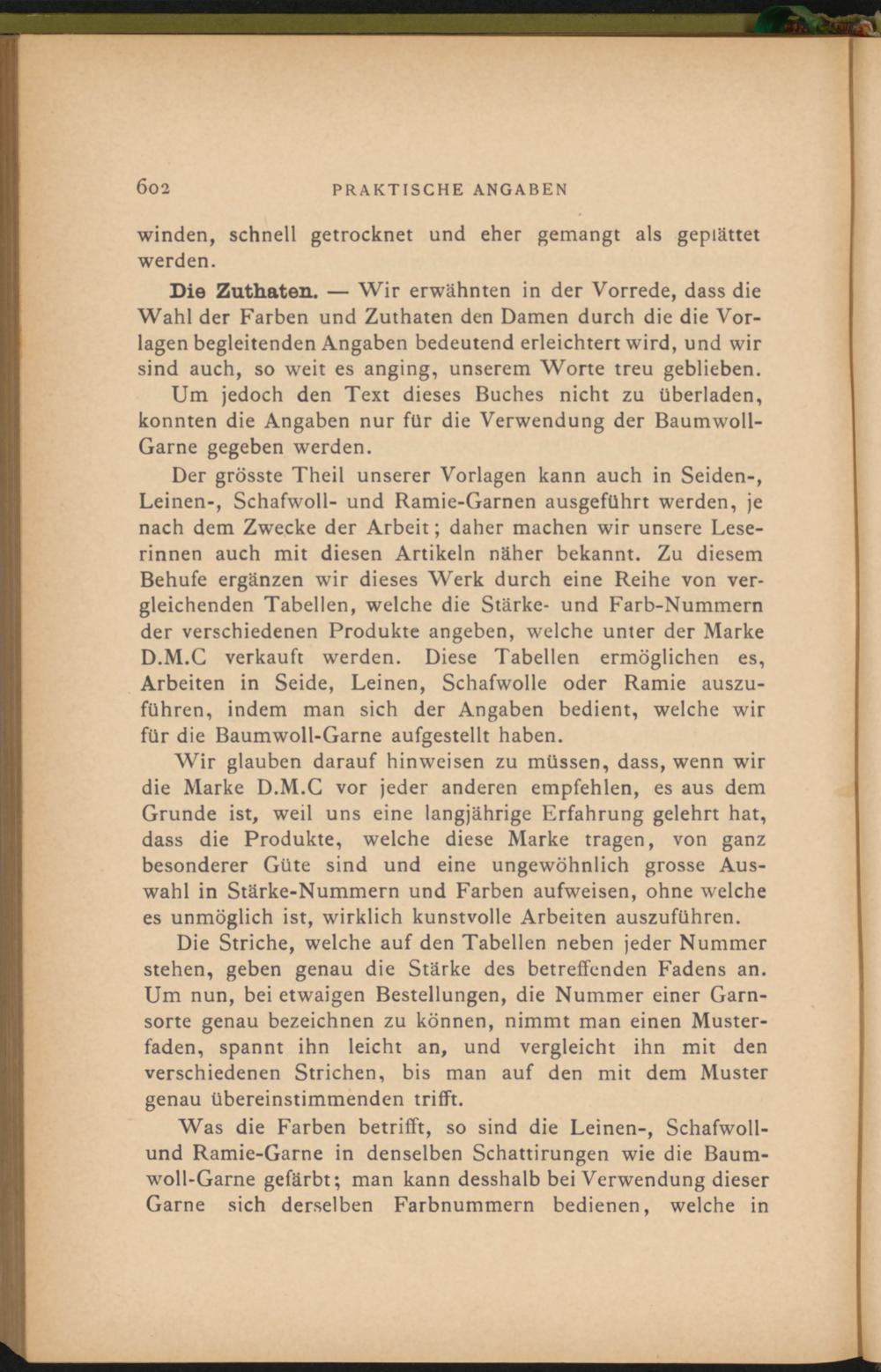 Wir glauben darauf hinweisen zu müssen, dass, wenn wir die Marke D.M.C vor jeder anderen empfehlen, es aus dem Grunde ist, weil uns eine langjährige Erfahrung gelehrt hat, dass die Produkte, welche diese Marke tragen, von ganz besonderer Güte sind und eine ungewöhnlich grosse Auswahl in Stärke-Nummern und Farben aufweisen, ohne welche es unmöglich ist, wirklich kunstvolle Arbeiten auszuführen.