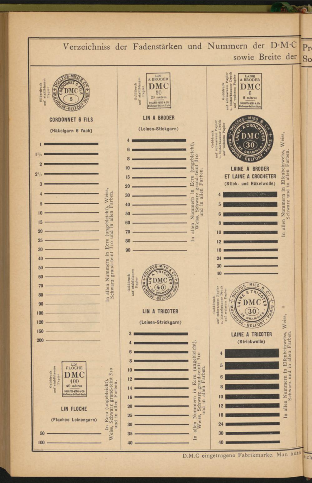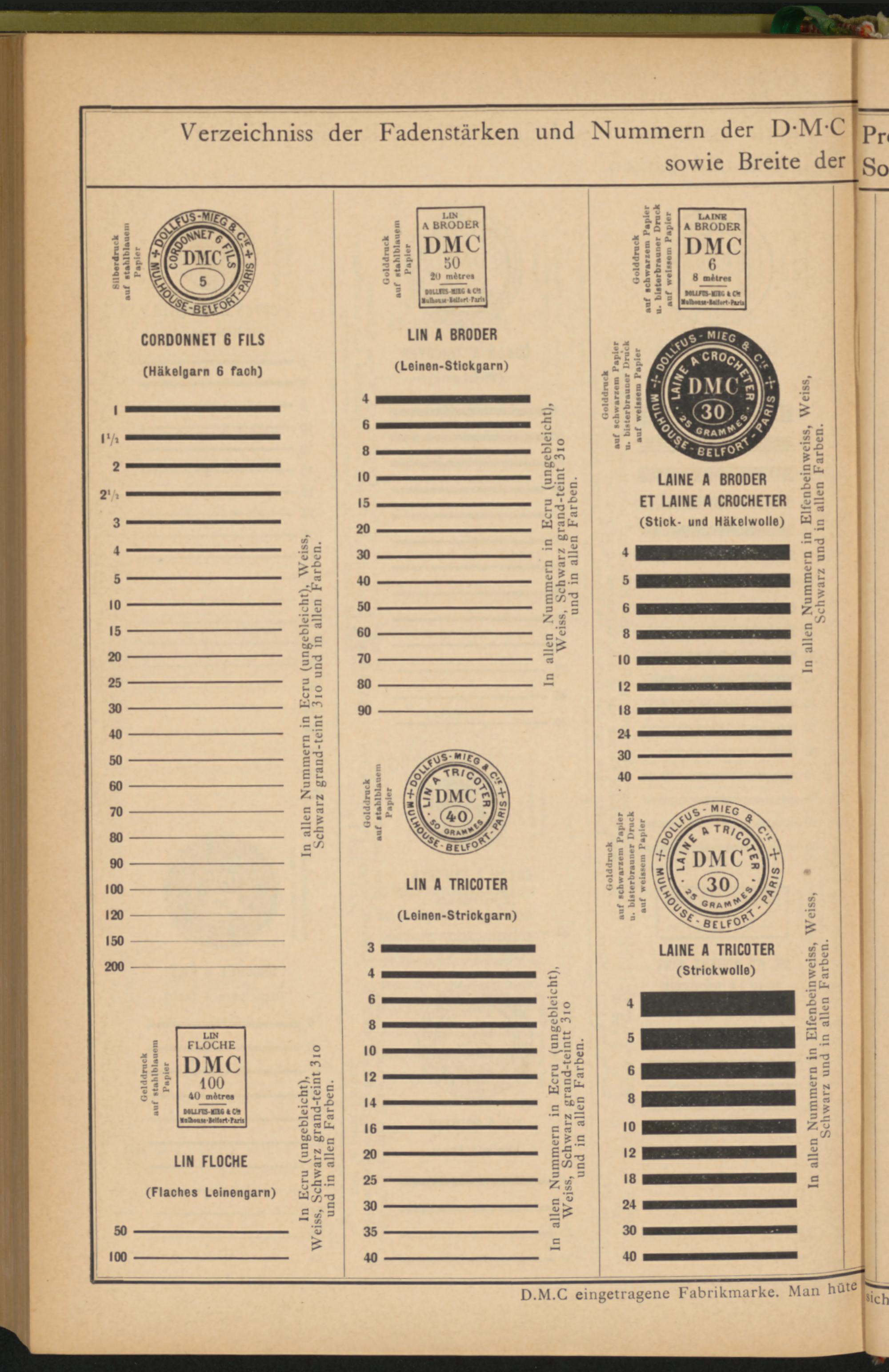 Verzeichniss der Fadenstärken und Nummern der D'M'C