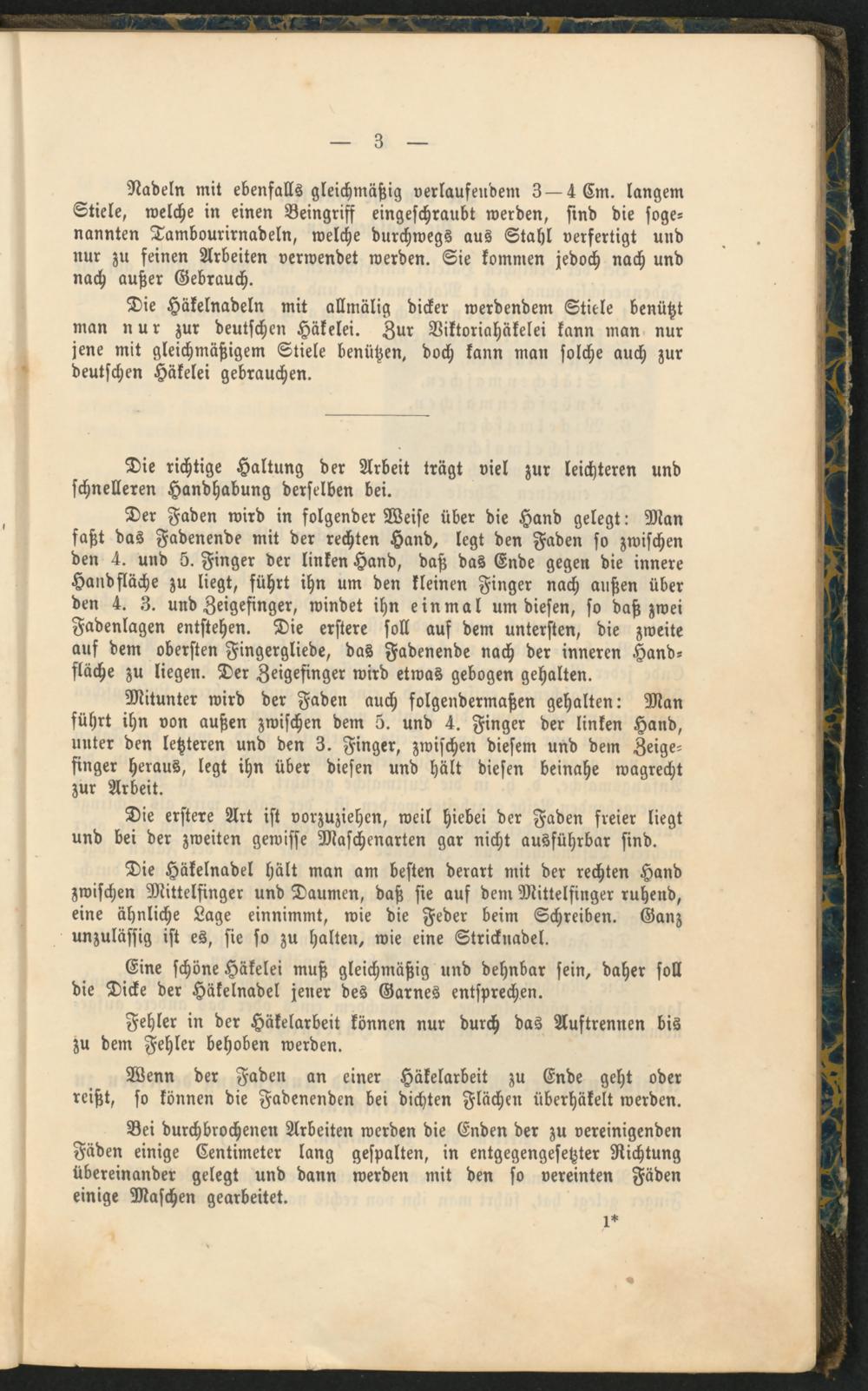 Die Häkelnadel hält man am besten derart mit der rechten Hand zwischen Mittelfinger und Daumen, daß sie auf dem Mittelfinger ruhend, eine ähnliche Lage einnimmt, wie die Feder beim Schreiben. Ganz unzulässig ist es, sie so zu halten, wie eine Stricknadel.