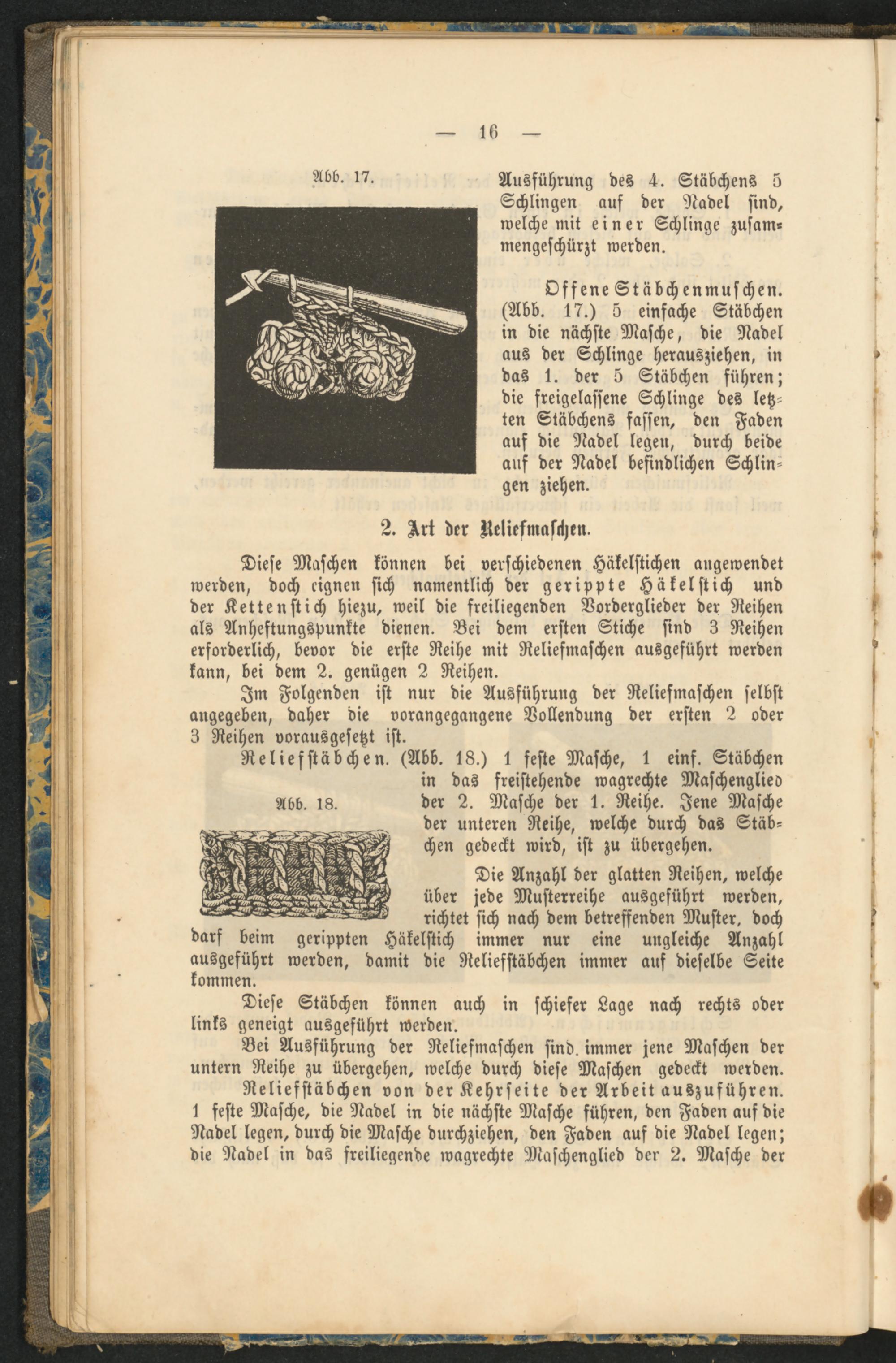 Relief st äbchen. (Abb. 18.) 1 feste Masche, 1 eins. Stäbchen in das freistehende wagrechte Maschenglieo Abb. 18. der 2. Masche der 1. Reihe. Jene Masche