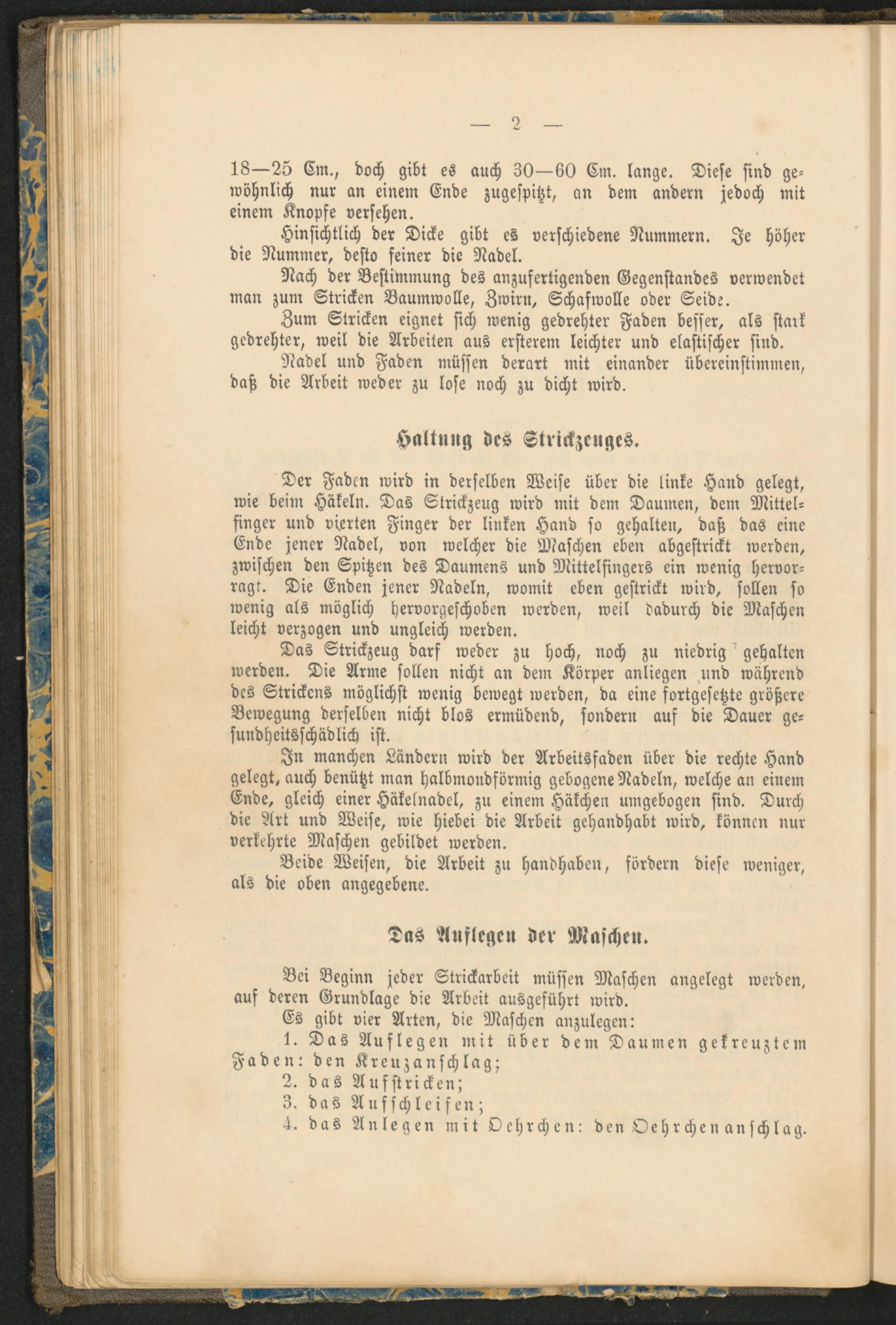 Der Faden wird in derselben Weise über die linke Hand gelegt, wie beim Häkeln. Das Strickzeug wird mit dem Daunren, dem Mittelfinger und vierten Finger der linken Hand so gehalten, daß das eine Ende jener Nadel, von welcher die Maschen eben abgestrickt werden, zwischen den Spitzen des Daumens und Mittelfingers ein wenig hervorragt. Die Enden jener Nadeln, womit eben gestrickt wird, sollen so wenig als möglich hervorgeschoben werden, weil dadurch die Maschen leicht verzogen und ungleich werden.