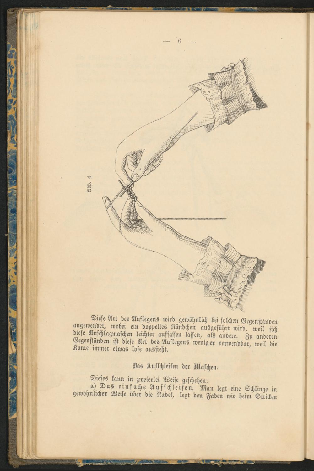 Dieses kann in zweierlei Weise geschehen: er) Das einfache Aufschleifen. Man legt eine Schlinge in gewöhnlicher Weise über die Nadel, legt den Faden wie beim Stricken
