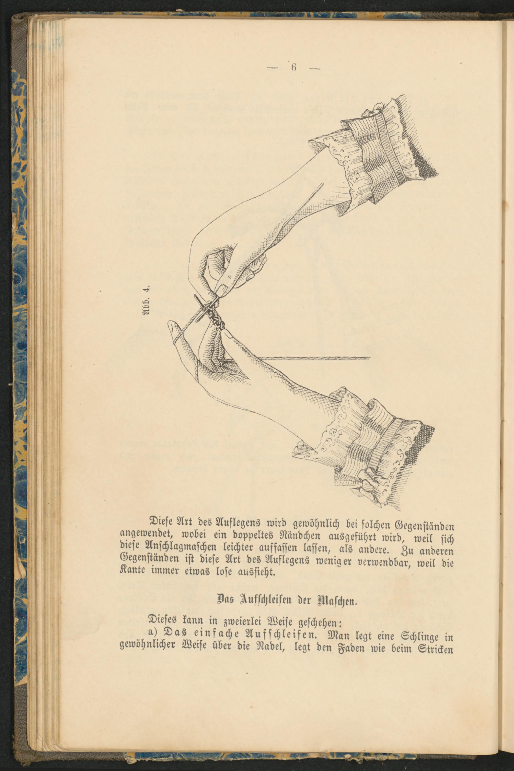 Diese Art des Auflegens wird gewöhnlich bei solchen Gegenständen angewendet, wobei ein doppeltes Rändchen ausgeführt wird, weil sich diese Anschlagmaschen leichter auffassen lassen, als andere. Zu anderen Gegenständen ist diese Art des Auflegens weniger verwendbar, weil die Kante immer etwas lose aussieht.