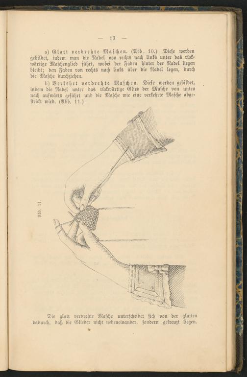 b) Verkehrt verdrehte Maschen. Diese werden gebildet, indem die Nadel unter das rückwärtige Glied der Masche von unten nach aufwärts geführt und die Masche wie eine verkehrte Masche abgestrickt wird. (Abb. 11.)