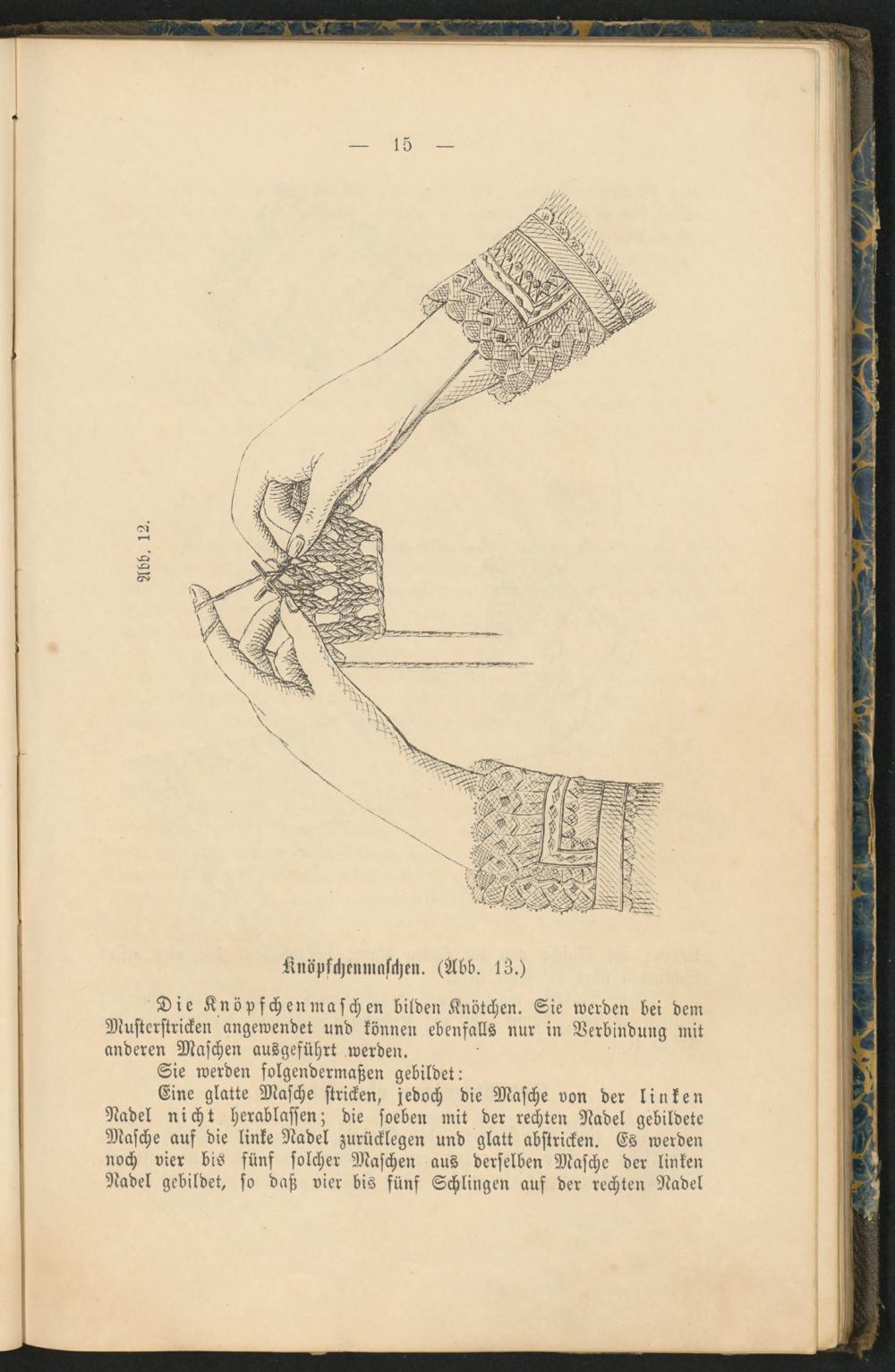 Eine glatte Masche stricken, jedoch die Masche von der linken Nadel nicht herablassen; die soeben mit der rechten Nadel gebildete Masche auf die linke Nadel zurücklegen und glatt abstricken. Es werden noch vier bis fünf solcher Maschen aus derselben Masche der linken Nadel gebildet, so daß vier bis fünf Schlingen auf der rechten Nadel