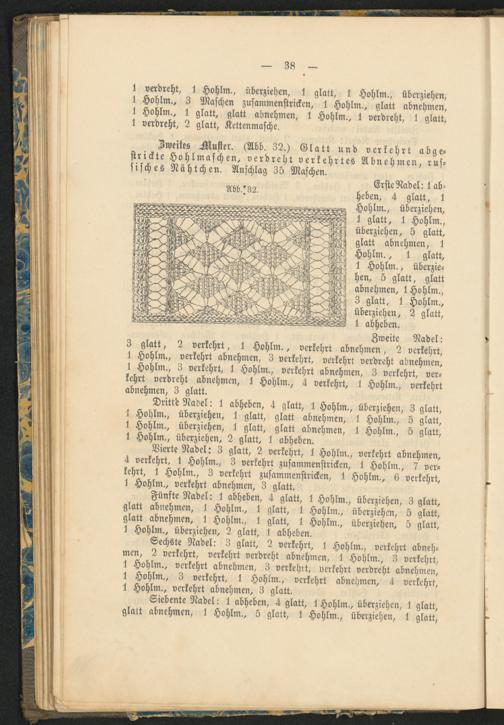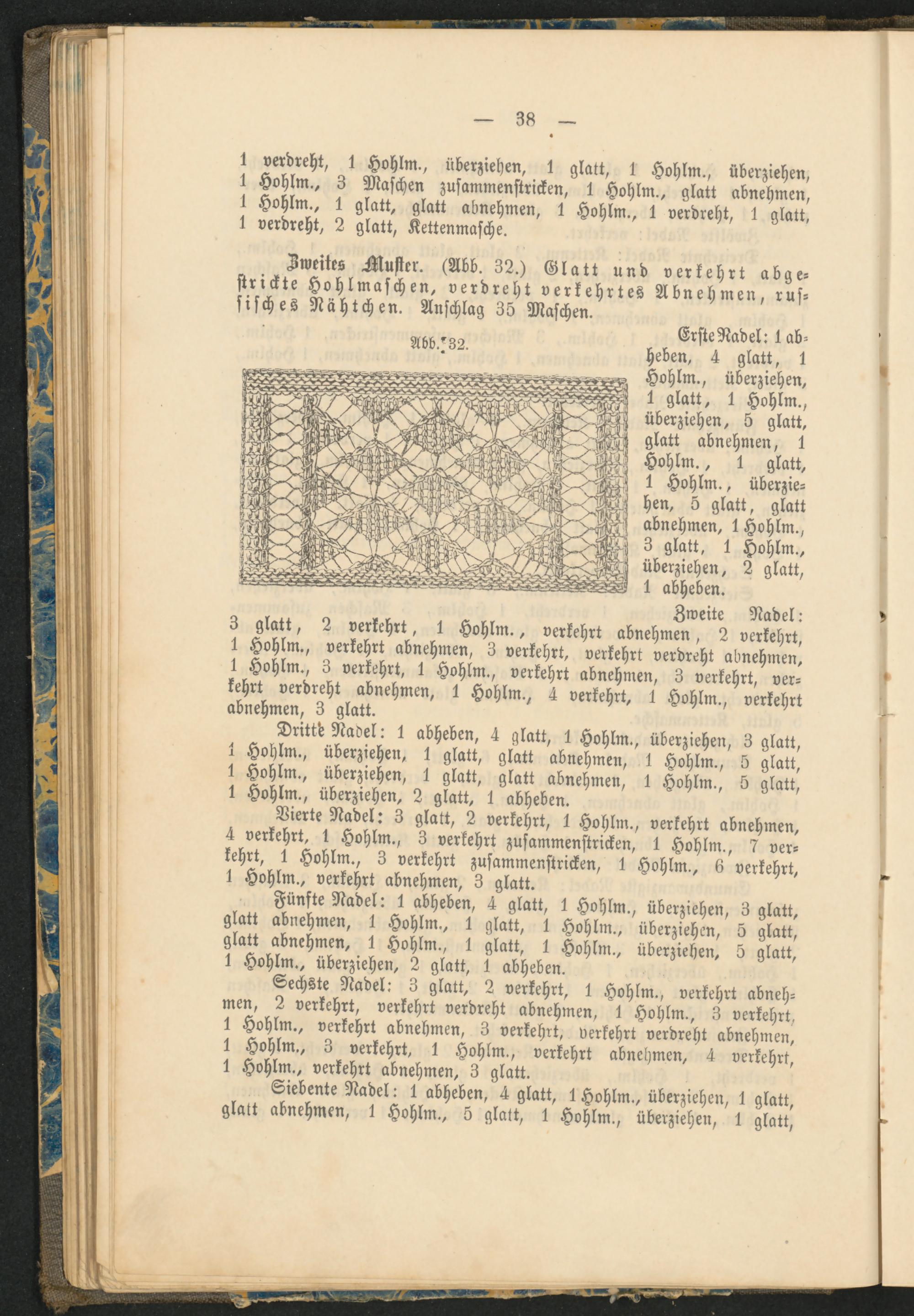 Iivnles Muster. (Abb. 32.) Glatt und verkehrt abgestrickte Hohlmaschen, verdreht verkehrtes Abnehmen, russisches Nähtchen. Anschlag 35 Maschen.