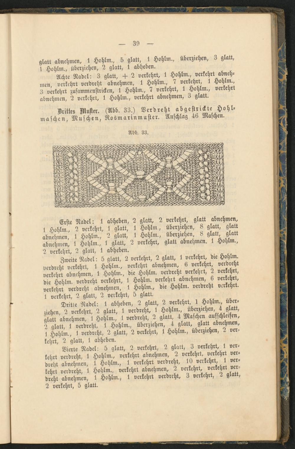 Drittes Muster. (Abb. 33.) Verdreht abgestrickte Hohl- maschen, Muschen, Rosmarinmuster. Anschlag 46 Maschen.