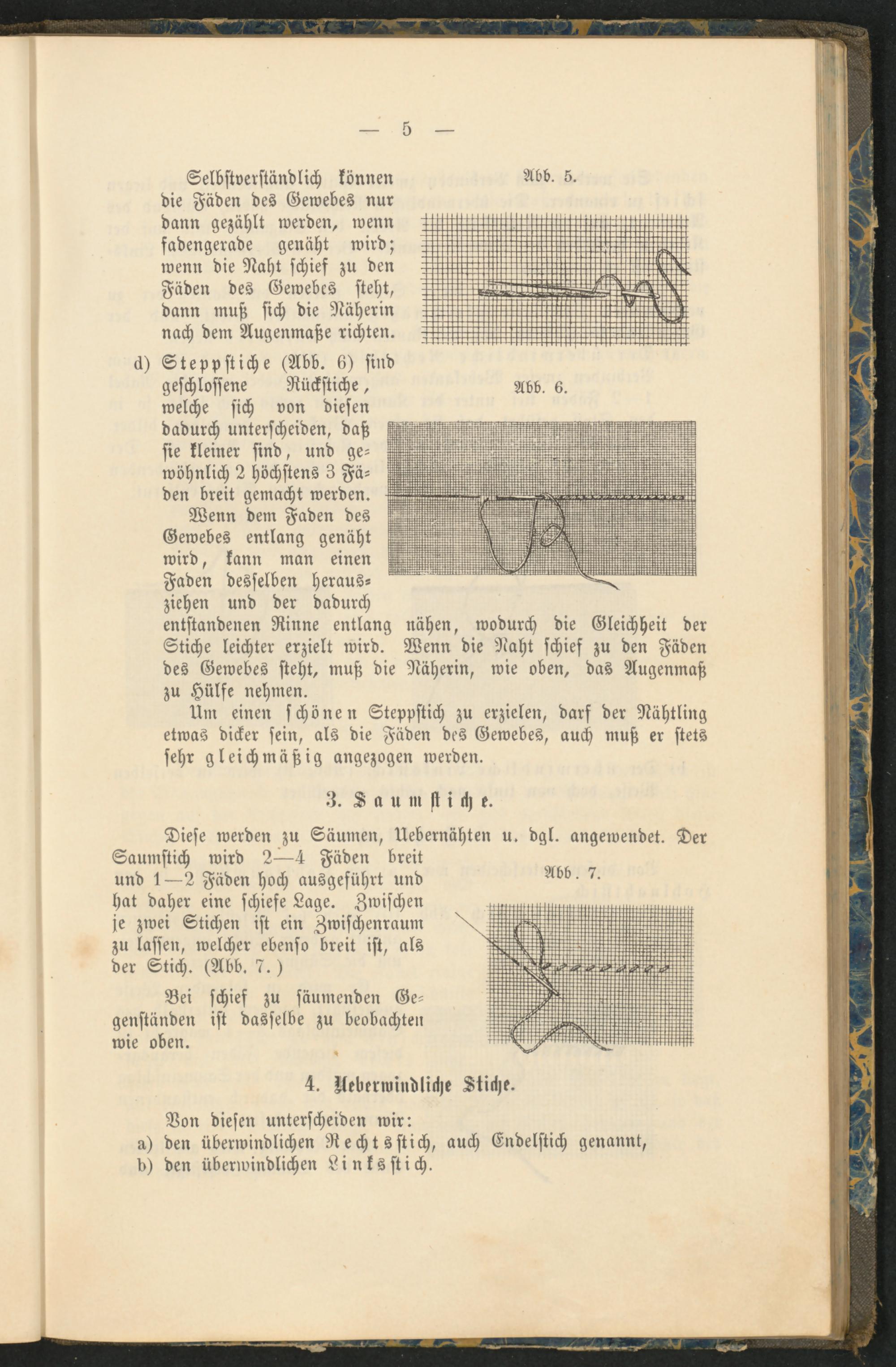 Diese werden zu Säumen, Uebernähten u. dgl. angewendet. Der Saumstich wird 2—4 Fäden breit und 1—2 Fäden hoch ausgeführt und hat daher eine schiefe Lage. Zwischen je zwei Stichen ist ein Zwischenraum zu lassen, welcher ebenso breit ist, als der Stich. (Abb. 7.)
