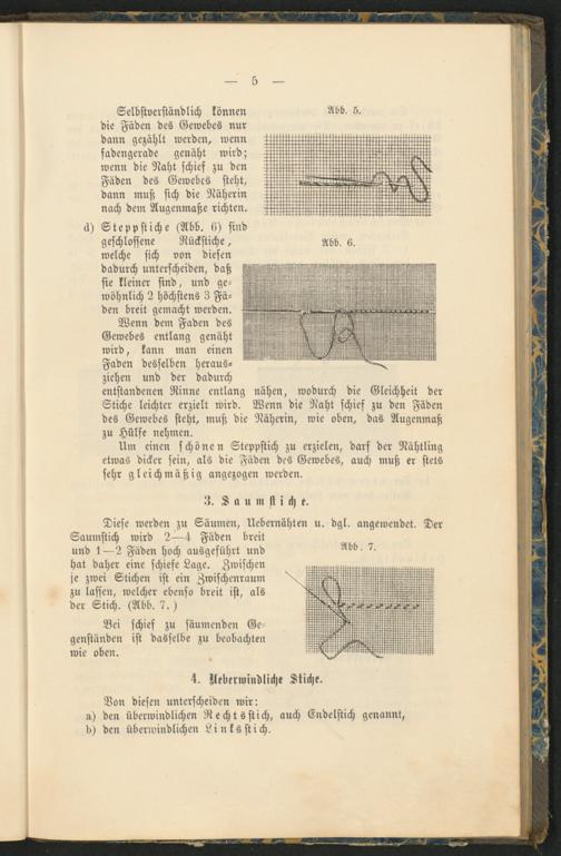 entstandenen Rinne entlang nähen, wodurch die Gleichheit der Stiche leichter erzielt wird. Wenn die Naht schief zu den Fäden des Gewebes steht, muß die Näherin, wie oben, das Augenmaß zu Hülfe nehmen.