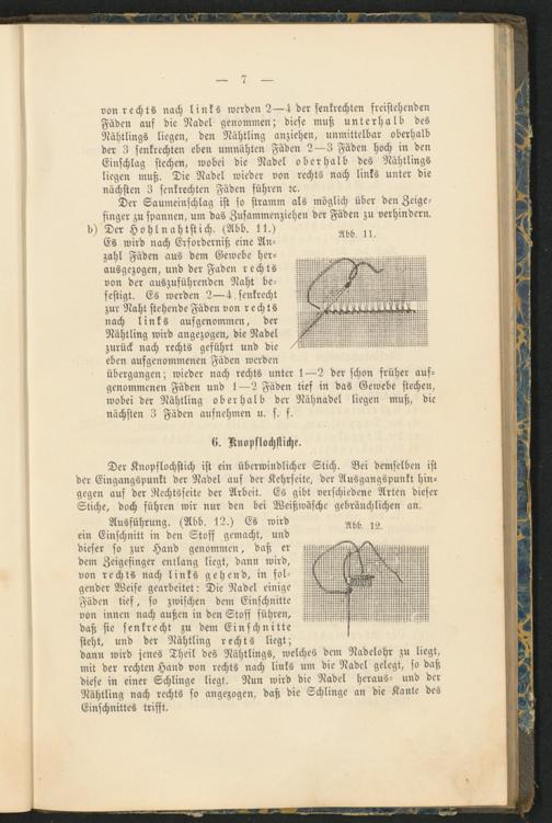 Ausführung. (Abb. 12.) Es wird ein Einschnitt in den Stoff gemacht, und dieser so zur Hand genommen, daß er dem Zeigefinger entlang liegt, dann wird, von rechts nach links gehend, in folgender Weise gearbeitet: Die Nadel einige Fäden tief, so zwischen dem Einschnitte von innen nach außen in den Stoff führen, daß sie senkrecht zu dem Einschnitte steht, und der Nähtling rechts liegt; dann wird jenes Theil des Nähtlings, welches dem Nadelohr zu liegt, mit der rechten Hand von rechts nach links um die Nadel gelegt, so daß diese in einer Schlinge liegt. Nun wird die Nadel heraus- und der Nähtling nach rechts so angezogen, daß die Schlinge an die Kante des Einschnittes trifft.