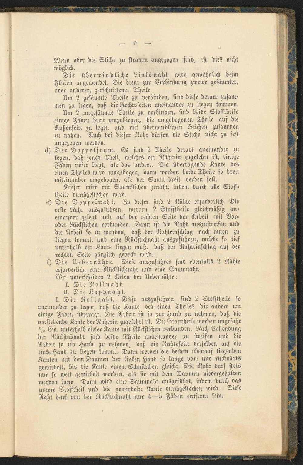 I. Die Rollnaht. Ditse auszuführen sind 2 Stofftheile so aneinander zu legen, daß die Kante des einen Theiles die andere um einige Fäden überragt. Die Arbeit ist so zur Hand zu nehmen, daß die vorstehende Kante der Näherin zugekehrt ist. Die Stofftheile werden ungefähr 1/z Cm. unterhalb dieser Kante mit Rückstichen verbunden. Nach Vollendung der Rückstichnaht sind beide Theile auseinander zu streifen und die Arbeit so zur Hand zu nehmen, daß die Nechtsseite derselben auf die linke Hand zu liegen kommt. Dann werden die beiden obenauf liegenden Kanten mit dem Daumen der linken Hand so lange vor- und rückwärts gewirbelt, bis die Kante einem Schnürchen gleicht. Die Naht darf stets nur so weit gewirbelt werden, als sie mit dem Daumen niedergehalten werden kann. Dann wird eine Saumnaht ausgeführt, indem durch das untere Stofftheil und die gewirbelte Kante durchgestochen wird. Diese Naht darf von der Rückstichnaht nur 4—5 Fäden entfernt sein.