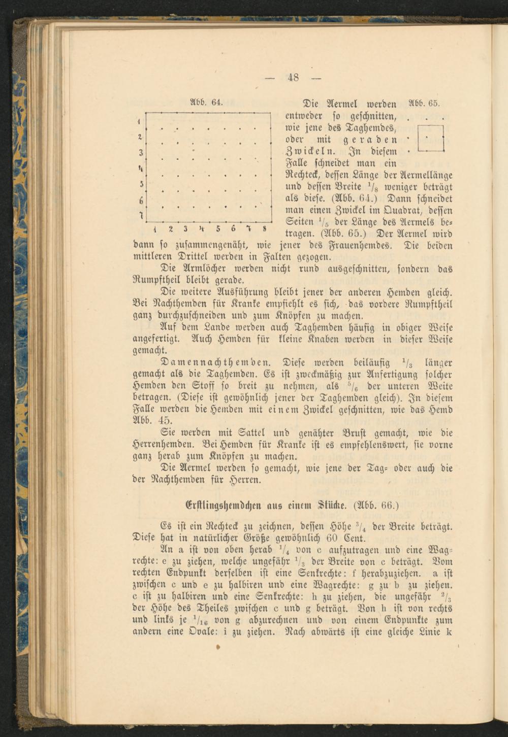 Damennachth emden. Diese werden beiläufig */z länger gemacht als die Taghemden. Es ist zweckmäßig zur Anfertigung solcher Hemden den Stoff so breit zu nehmen, als der unteren Weite betragen. (Diese ist gewöhnlich jener der Taghemden gleich). In diesem Falle werden die Hemden mit einem Zwickel geschnitten, wie das Hemd Abb. 45.