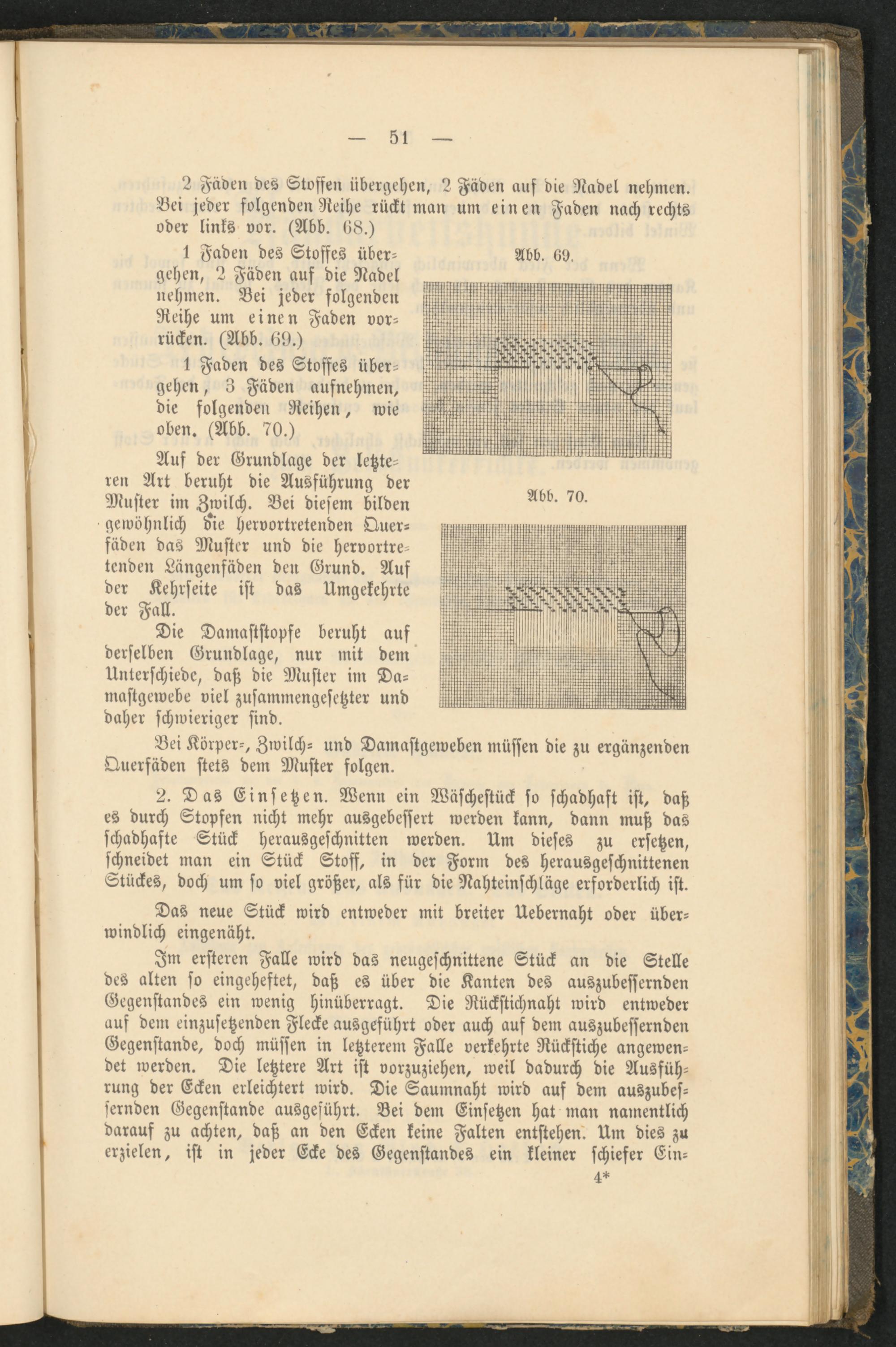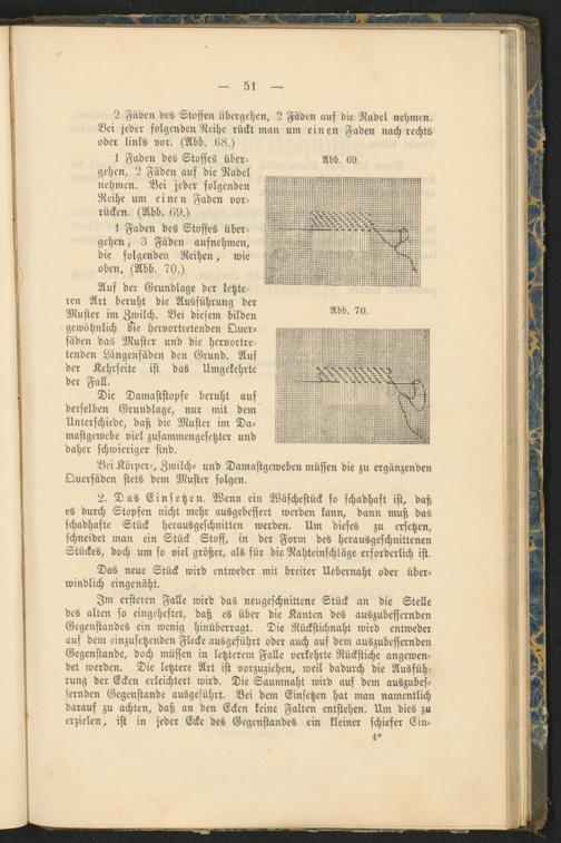 1 Faden des Stoffes übergehen , 3 Fäden aufnehmen, die folgenden Reihen, wie oben. (Abb. 70.)