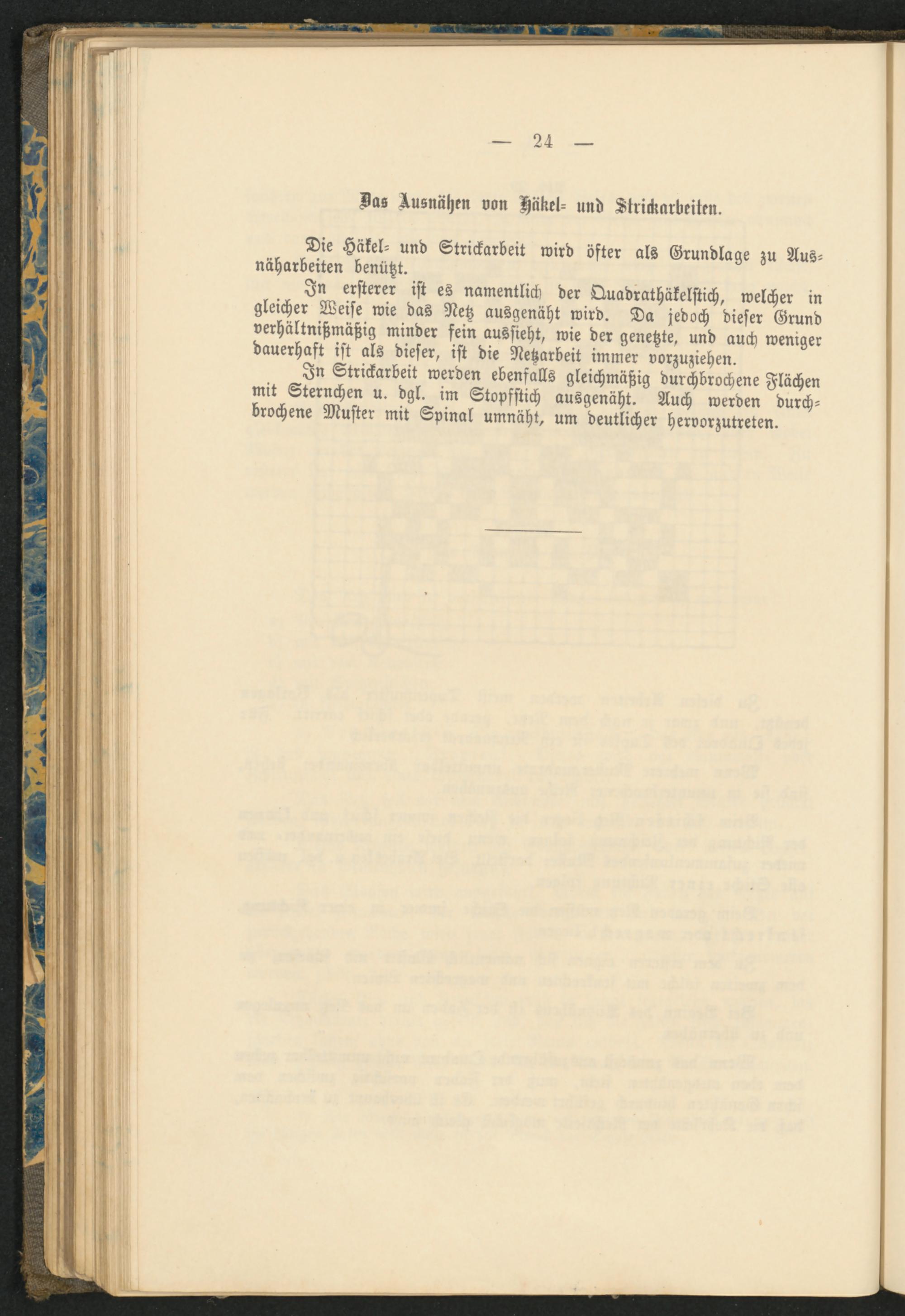 In ersterer ist es namentlich der Quadrathäkelstich, welcher in gleicher Weise wie das Netz ausgenäht wird. Da jedoch dieser Grund verhältnißmäßig minder fein aussieht, wie der genetzte, und auch weniger dauerhaft ist als dieser, ist die Netzarbeit immer vorzuziehen.