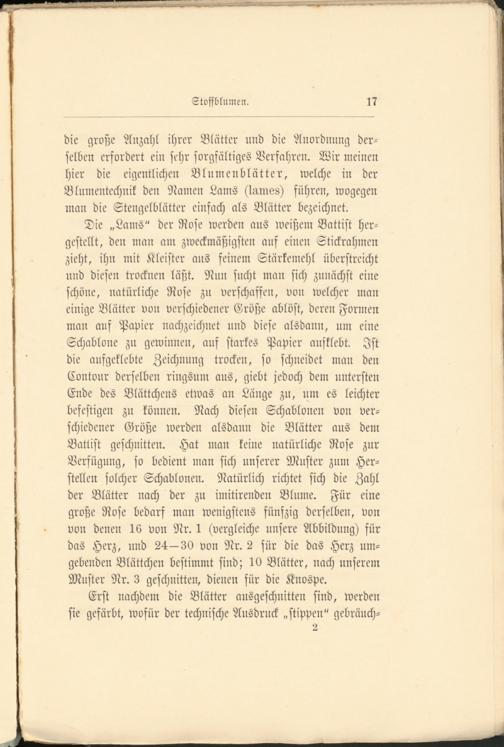 die große Anzahl ihrer Blätter und die Anordnung derselben erfordert ein sehr sorgfältiges Verfahren. Wir meinen hier die eigentlichen Blumenblätter, welche in der Blumentechnik den Namen Lams (Ininach führen, wogegen man die Stengelblütter einfach als Blätter bezeichnet.