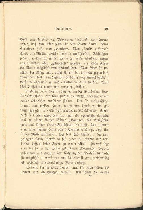 Griff eine kreisförmige Bewegung, während man darauf achtet, daß sich keine Falte in dem Blatte bildet. Dies Verfahren heißt man „Boulen". Man „boult" auf diese Weise alle Blätter, welche die Rose umschließen. Diejenigen jedoch, welche sich in der Mitte der Rose befinden, müssen etwas plissirt oder „geknörpelt" werden, um deren Form der Natur möglichst treu nachzubilden. Man faltet sie zunächst der Länge nach, preßt sie mit der Pincette gegen das Kröskissen, legt sie in derselben Richtung noch einmal doppelt, preßt sie abermals an und entfaltet sie dann wieder. Auch dies Verfahren nennt man kurzweg „krösen".