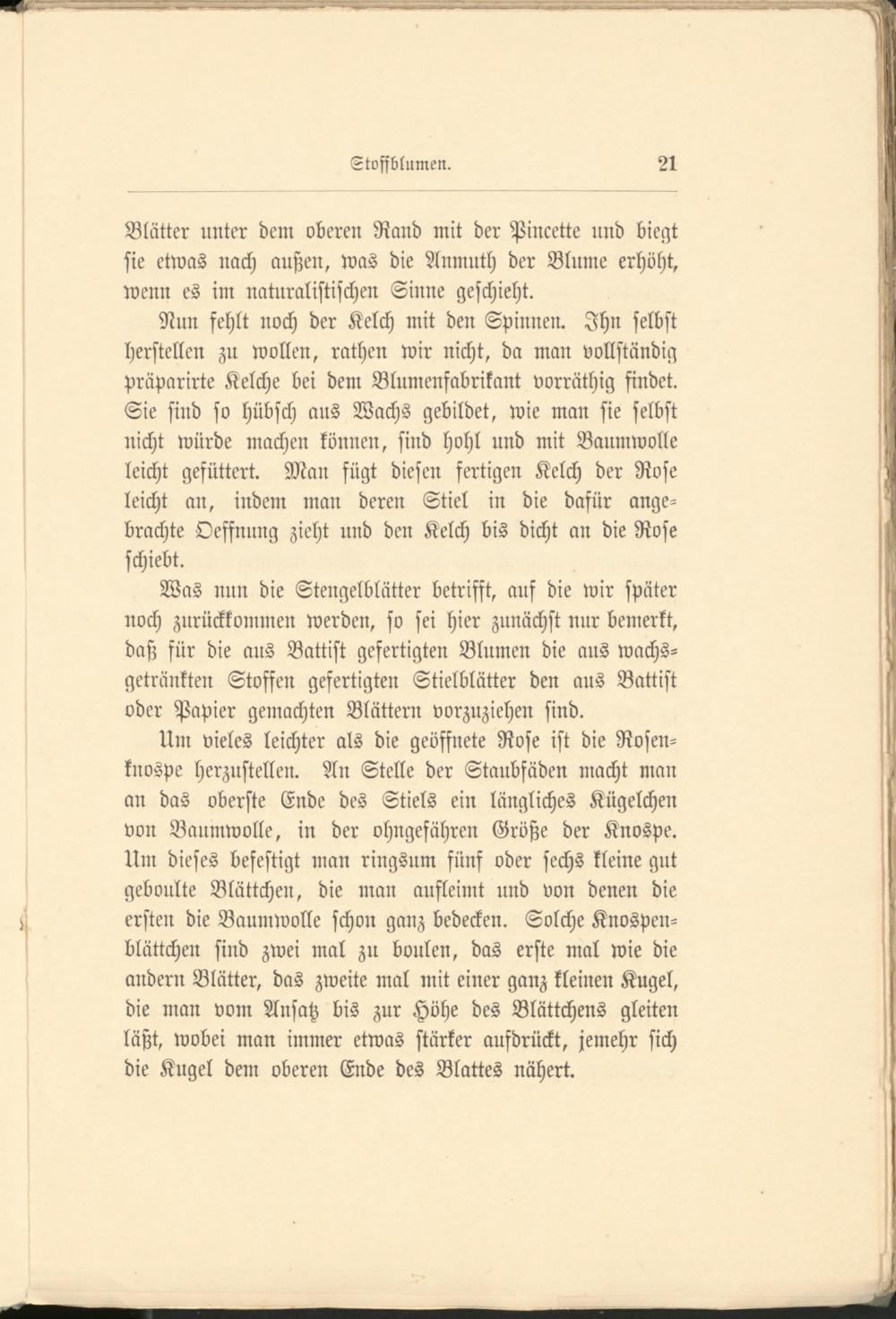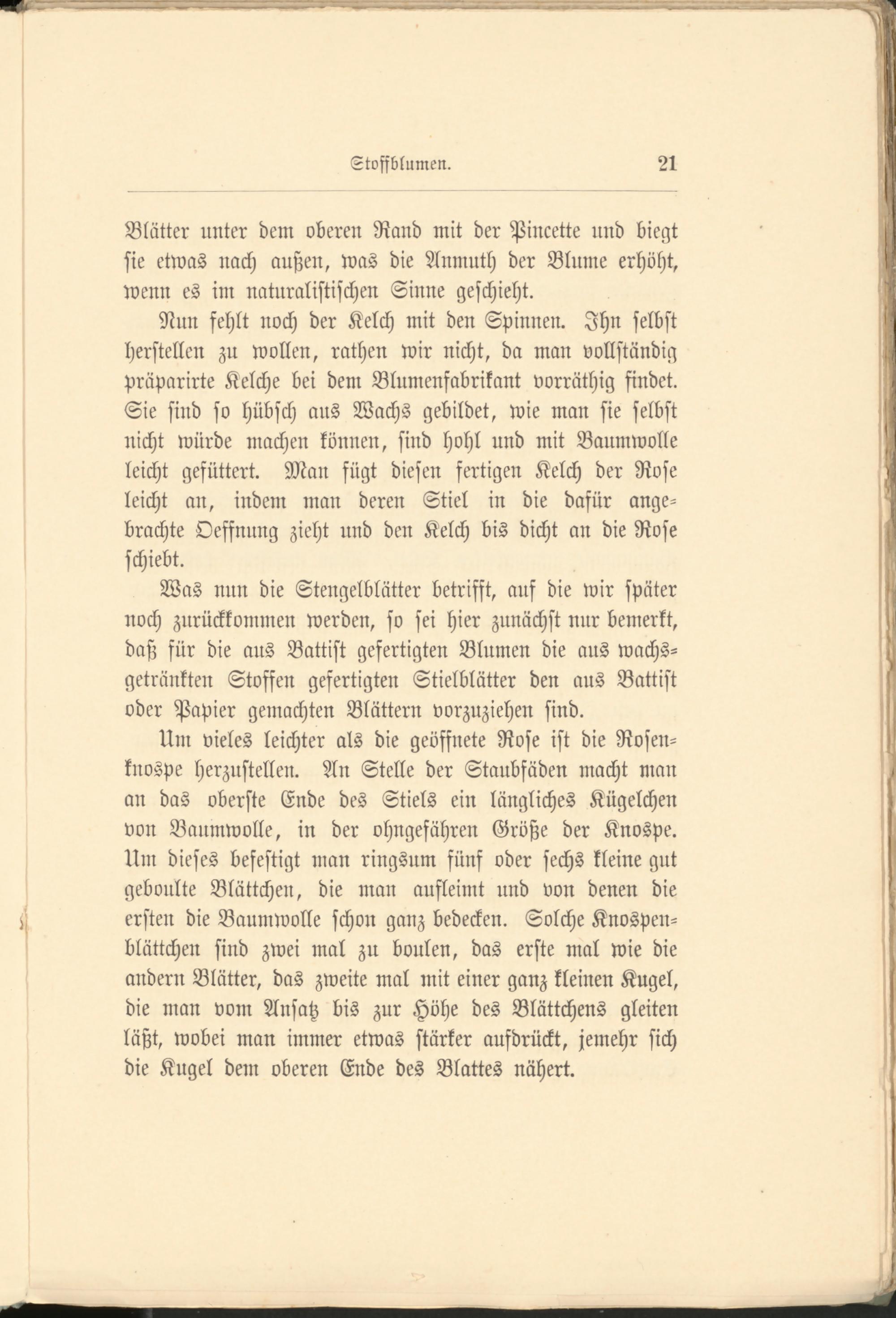 Was nun die Stengelblätter betrifft, auf die wir später noch zurückkommen werden, so sei hier zunächst nur bemerkt, daß für die aus Battist gefertigten Blumen die aus wachs- getränkten Stoffen gefertigten Stielblätter den aus Battist oder Papier gemachten Blättern vorzuziehen sind.