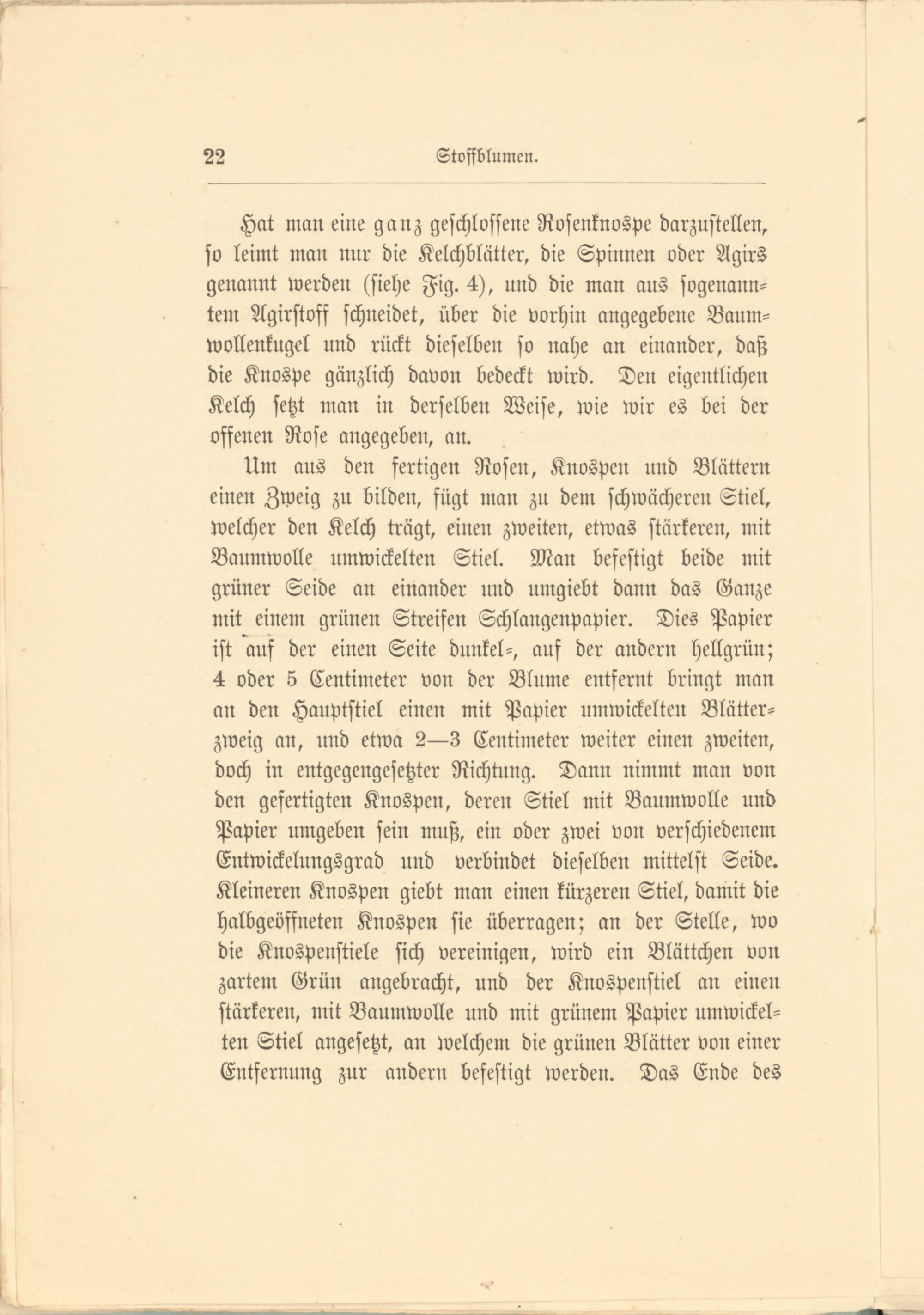 Um aus den fertigen Rosen, Knospen und Blättern einen Zweig zu bilden, fügt man zu dem schwächeren Stiel, welcher den Kelch trägt, einen zweiten, etwas stärkeren, mit Baumwolle umwickelten Stiel. Man befestigt beide mit grüner Seide an einander und umgiebt dann das Ganze mit einem grünen Streifen Schlangenpapier. Dies Papier ist auf der einen Seite dunkel-, auf der andern hellgrün; 4 oder 5 Centimeter von der Blume entfernt bringt man an den Hauptstiel einen mit Papier umwickelten Blütter- zweig an, und etwa 2—3 Centimeter weiter einen zweiten, doch in entgegengesetzter Richtung. Dann nimmt man von den gefertigten Knospen, deren Stiel mit Baumwolle und Papier umgeben sein muß, ein oder zwei von verschiedenem Entwickelungsgrad und verbindet dieselben mittelst Seide. Kleineren Knospen giebt man einen kürzeren Stiel, damit die halbgeöffneten Knospen sie überragen; an der Stelle, wo die Knospenstiele sich vereinigen, wird ein Blättchen von zartem Grün angebracht, und der Knospenstiel an einen stärkeren, mit Baumwolle und mit grünem Papier umwickelten Stiel angesetzt, an welchem die grünen Blätter von einer Entfernung zur andern befestigt werden. Das Ende des