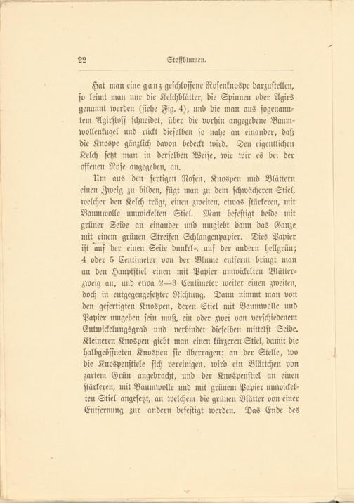 Hat man eine ganz geschlossene Rosenknospe darzustellen, so leimt man nur die Kelchblätter, die Spinnen oder Agirs genannt werden (siehe Fig. 4), und die man aus sogenanntem Agirstofs schneidet, über die vorhin angegebene Baum- wollenkugel und rückt dieselben so nahe an einander, daß die Knospe gänzlich davon bedeckt wird. Den eigentlichen Kelch setzt man in derselben Weise, wie wir es bei der offenen Rose angegeben, an.